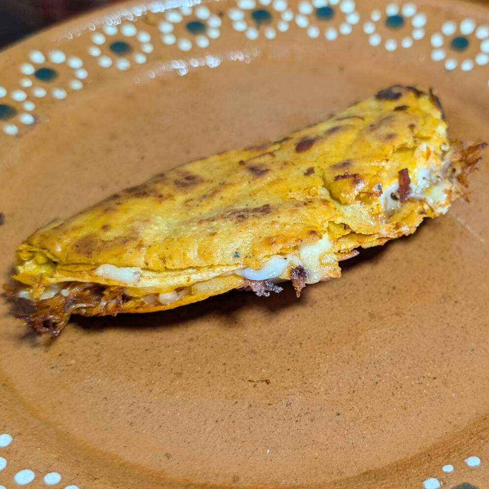 Quesadilla con tortilla de maíz grande recién hecha, queso derretido y guiso a elección.