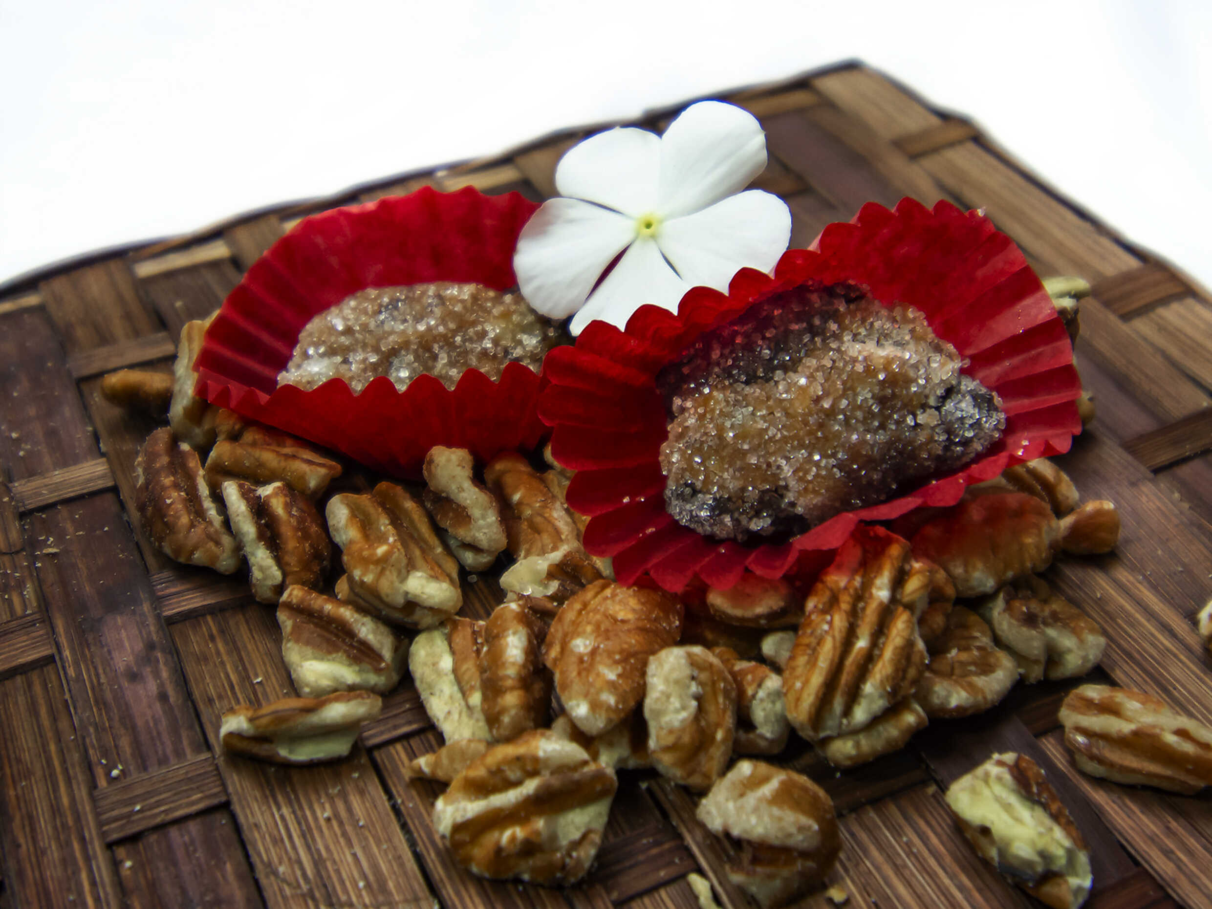 Ciruela sin hueso rellena con dulce de leche y nuez.
