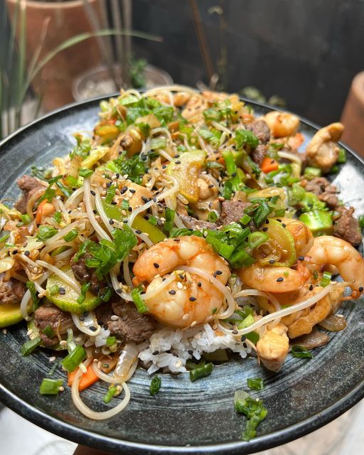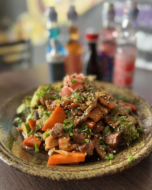 Salteado de res, camarón o pollo y verduras sazonadas con salsa Teriyaki o soja. Acompañado con arroz blanco al vapor, decorado con cebollín y ajonjolí.