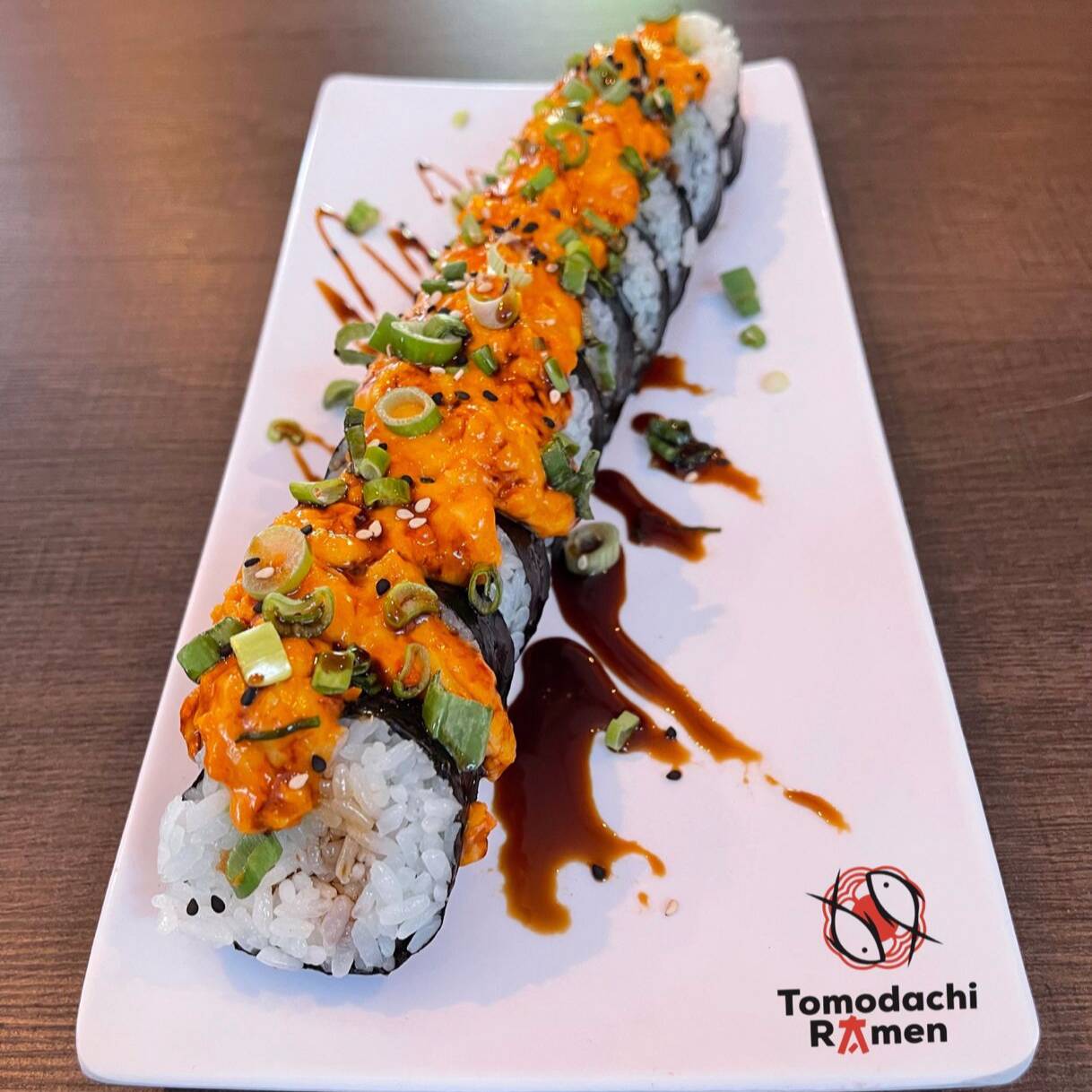 Maki con alga por dentro, capeado en tempura, relleno de salmón, queso crema, pepino y aguacate. Decorado con Sriracha, salsa de anguila, cebollín y ajonjolí.