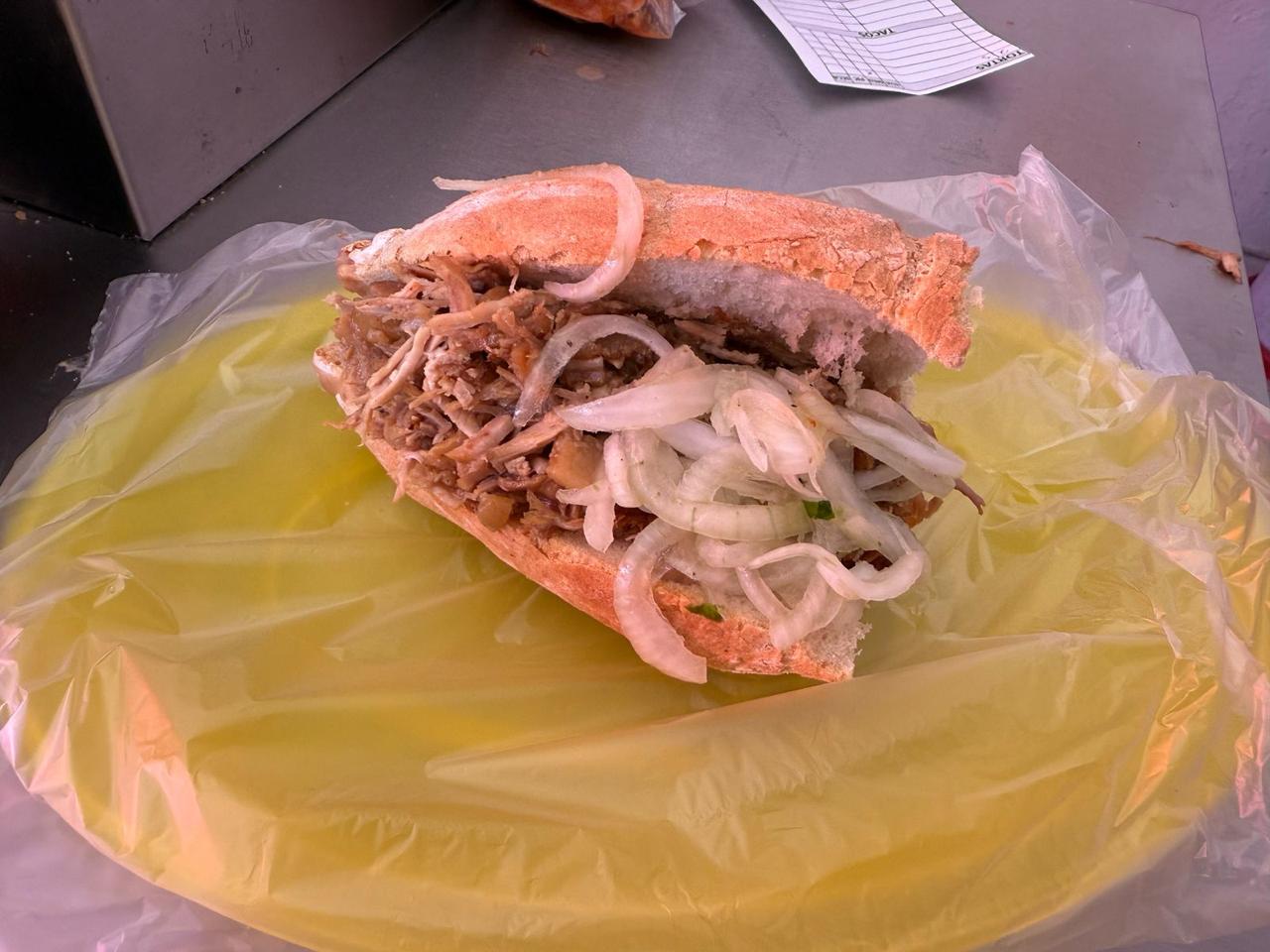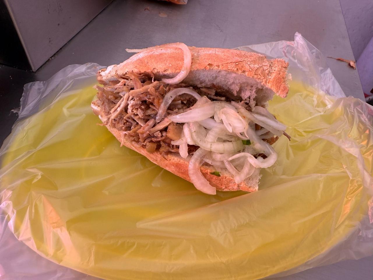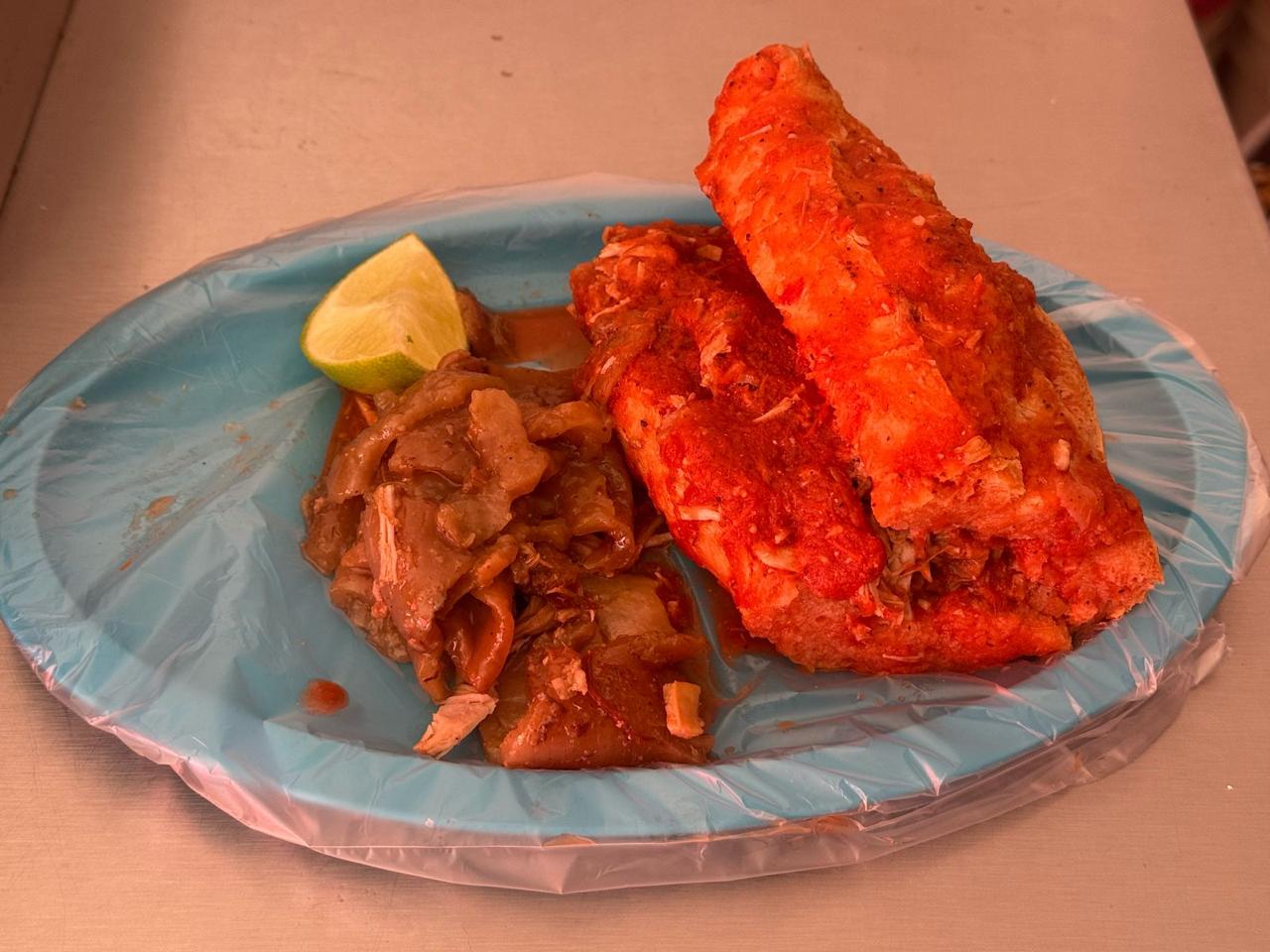 Torta ahogada de salsa y carne de cerdo.