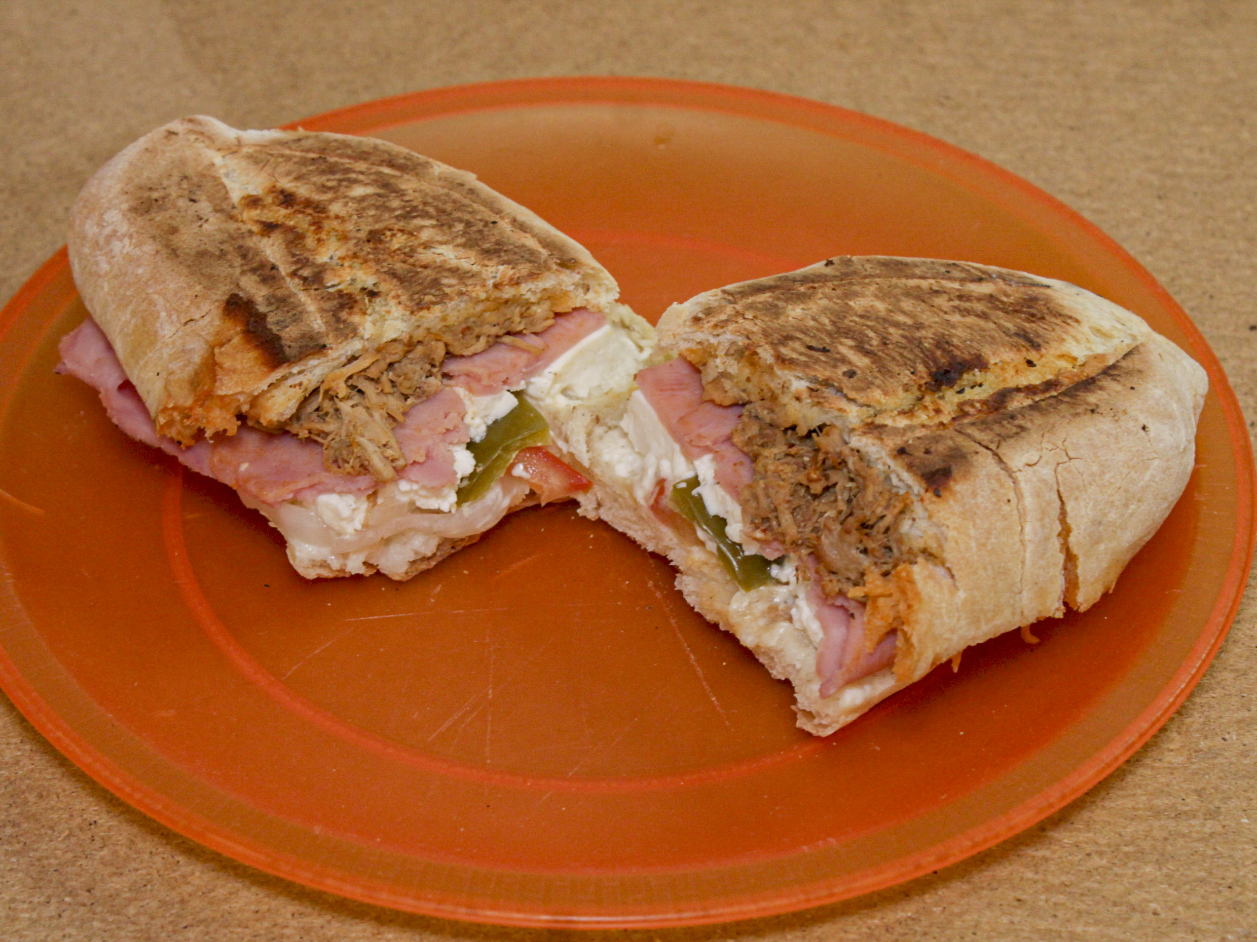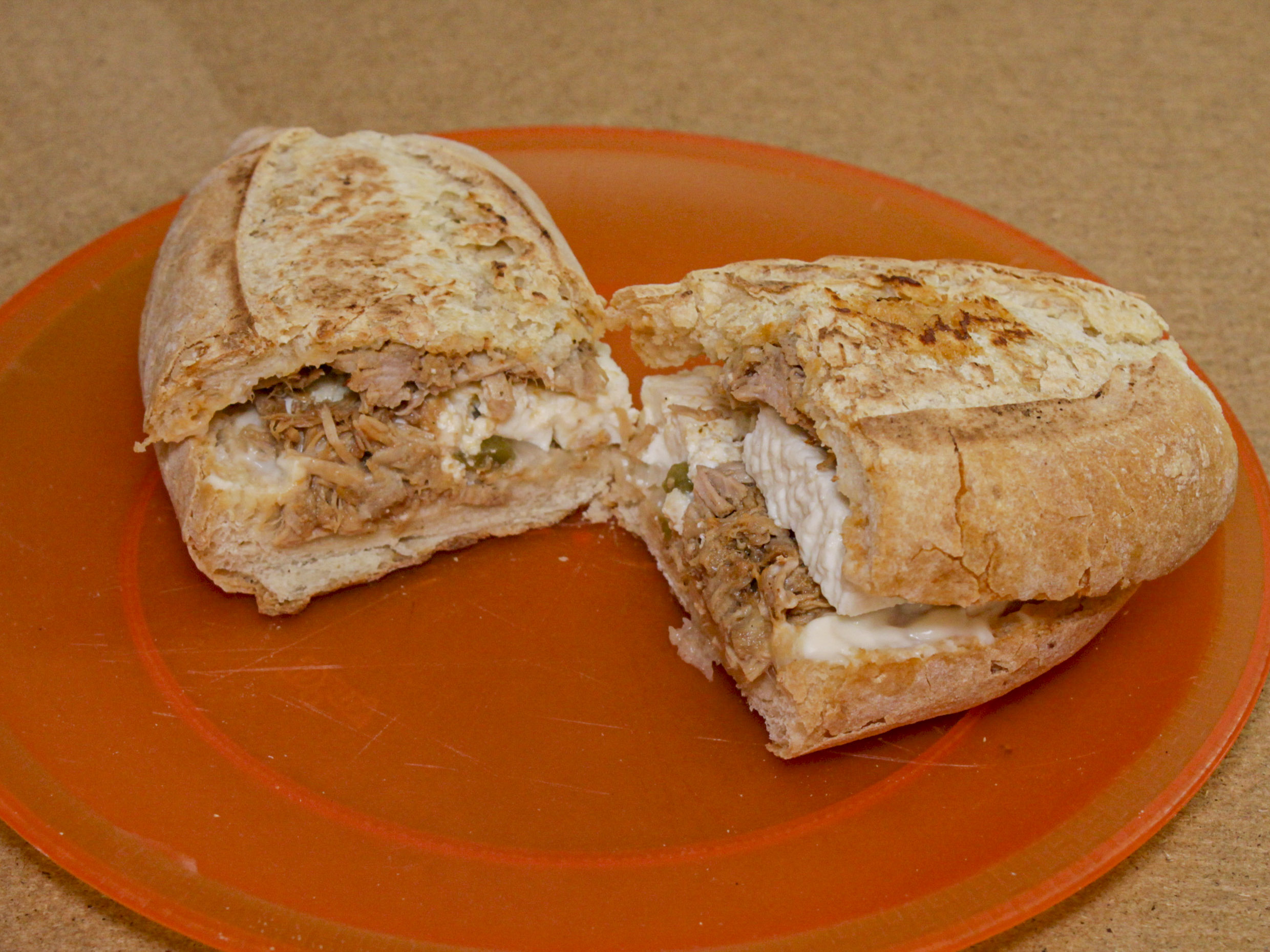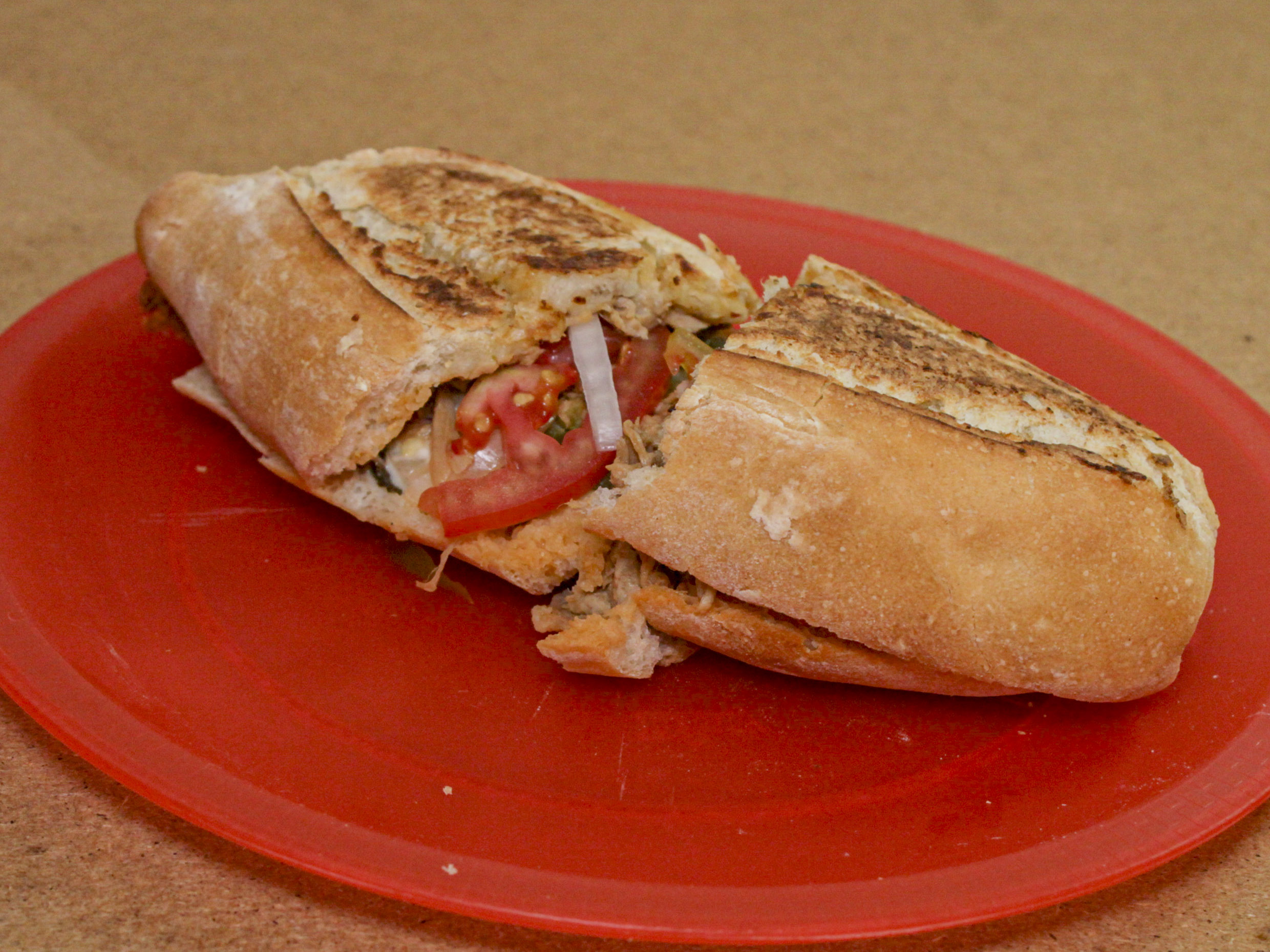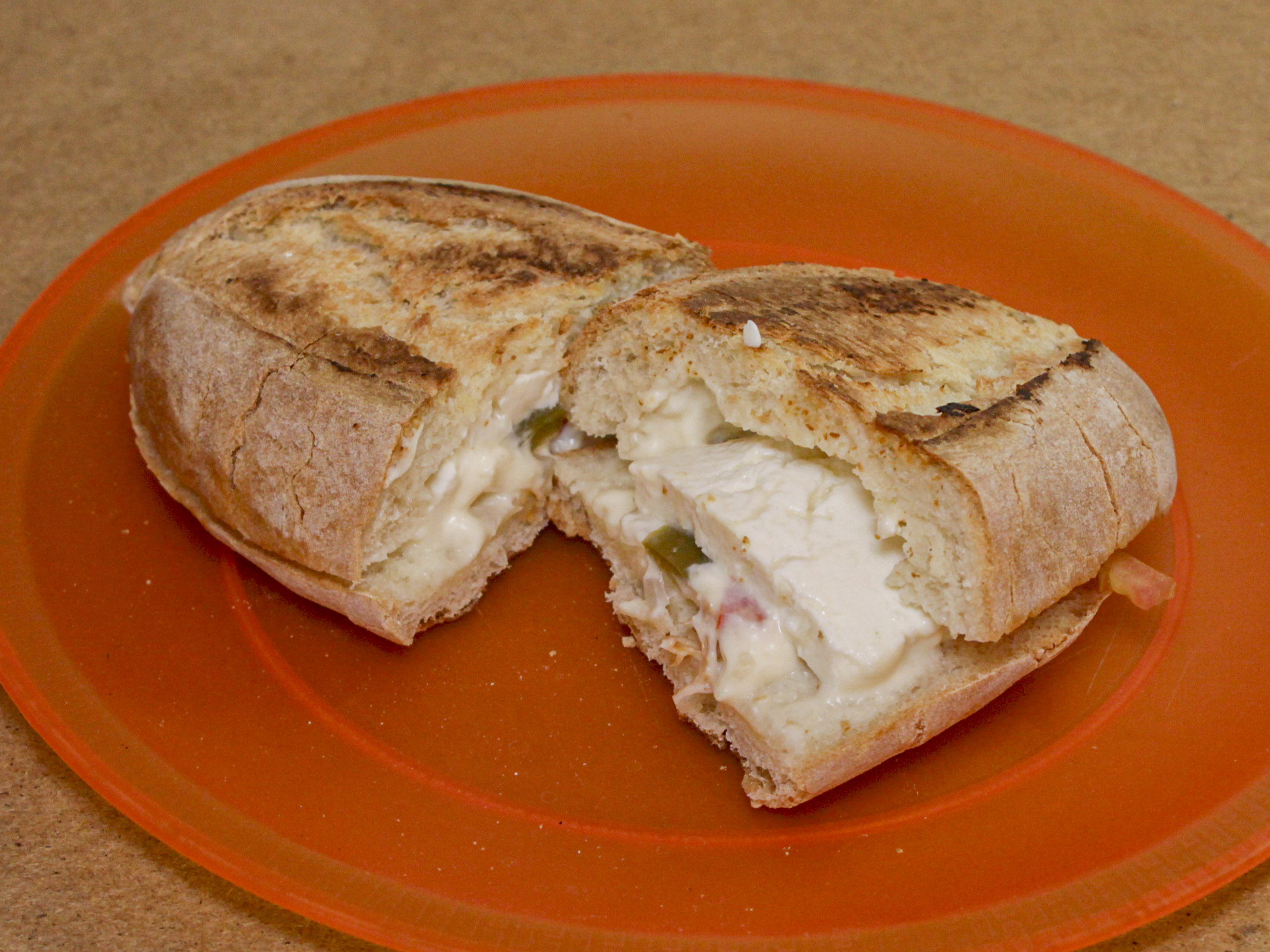 Torta con pierna, panela, jamón y escoge (jitomate, chile y cebolla) (Porción personal)