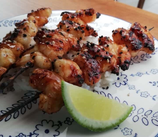3 brochetas a la parrilla sazonadas con teriyaki casera