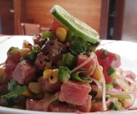 Atun en cubos, elote, pimiento, cebolla, aceite de oliva, soya y sake