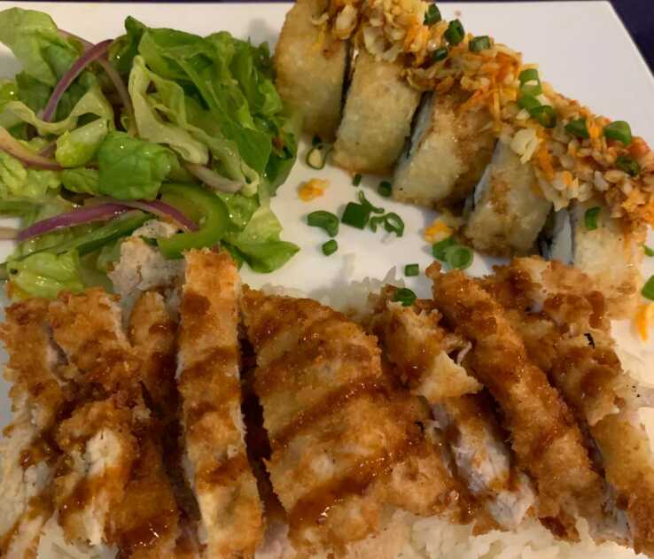 Tonkatsu (una pieza de katsu bañada en salsa Tonkatsu y cebollín, acompañada con arroz Gohan). 1/2 Fried especial (camarón, queso crema pepino y aguacate por dentro). Ensalada Tampico, spicy mayo, salsa de anguila, cebollín y ajonjolí. Sarada (ensalada de lechuga, cebolla, pepino y jitomate).