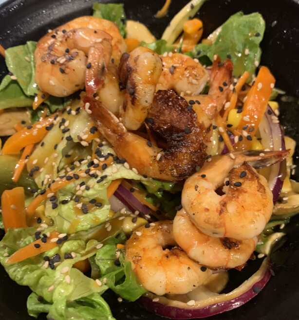 Rollo relleno de queso crema, pepino y aguacate. Cubierto de camarón, ensalada de tampico, cebollín, salsa de anguila y ajonjolí.