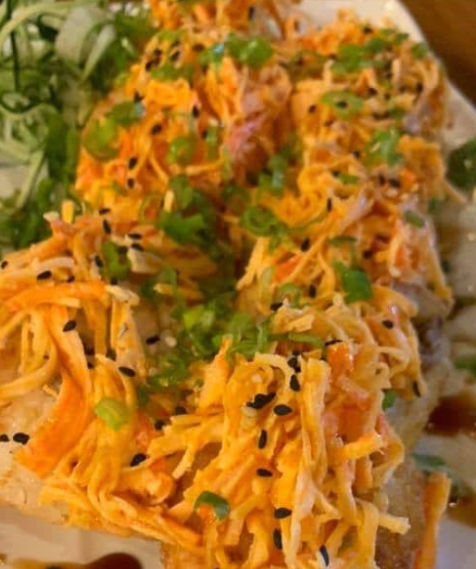 Rollo empanizado. Por dentro camarón, queso crema, pepino y aguacate. Por fuera ensalada tampico, cebollín, ajonjolí y salsa de anguila.