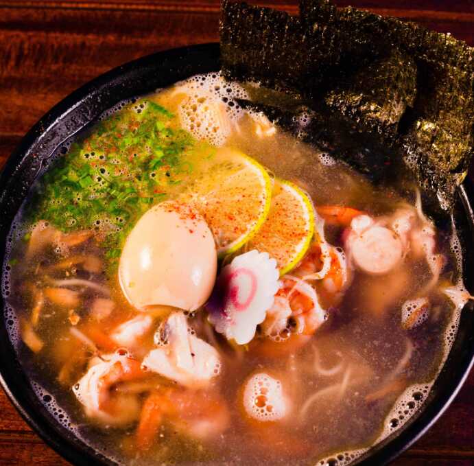 Sopa de mariscos con pulpo, camarón, kanikama, aguacate, fideos de arroz y caldo dashi.