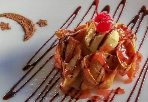 6 gyozas rellenas de queso crema, fritas, servidas con helado de vainilla, chocolate y fresa.