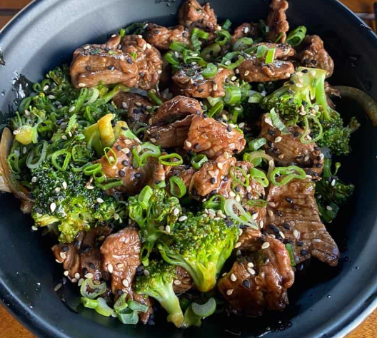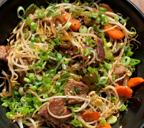 Salteado de res, cebolla, champiñones, salsa hoisin.
