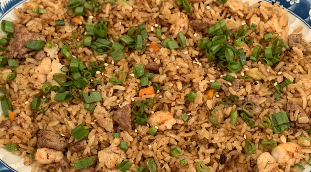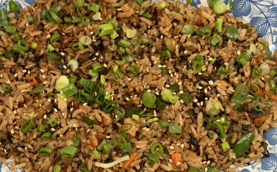 Arroz frito salteado con verduras, sazonado con salsa de soya y pollo