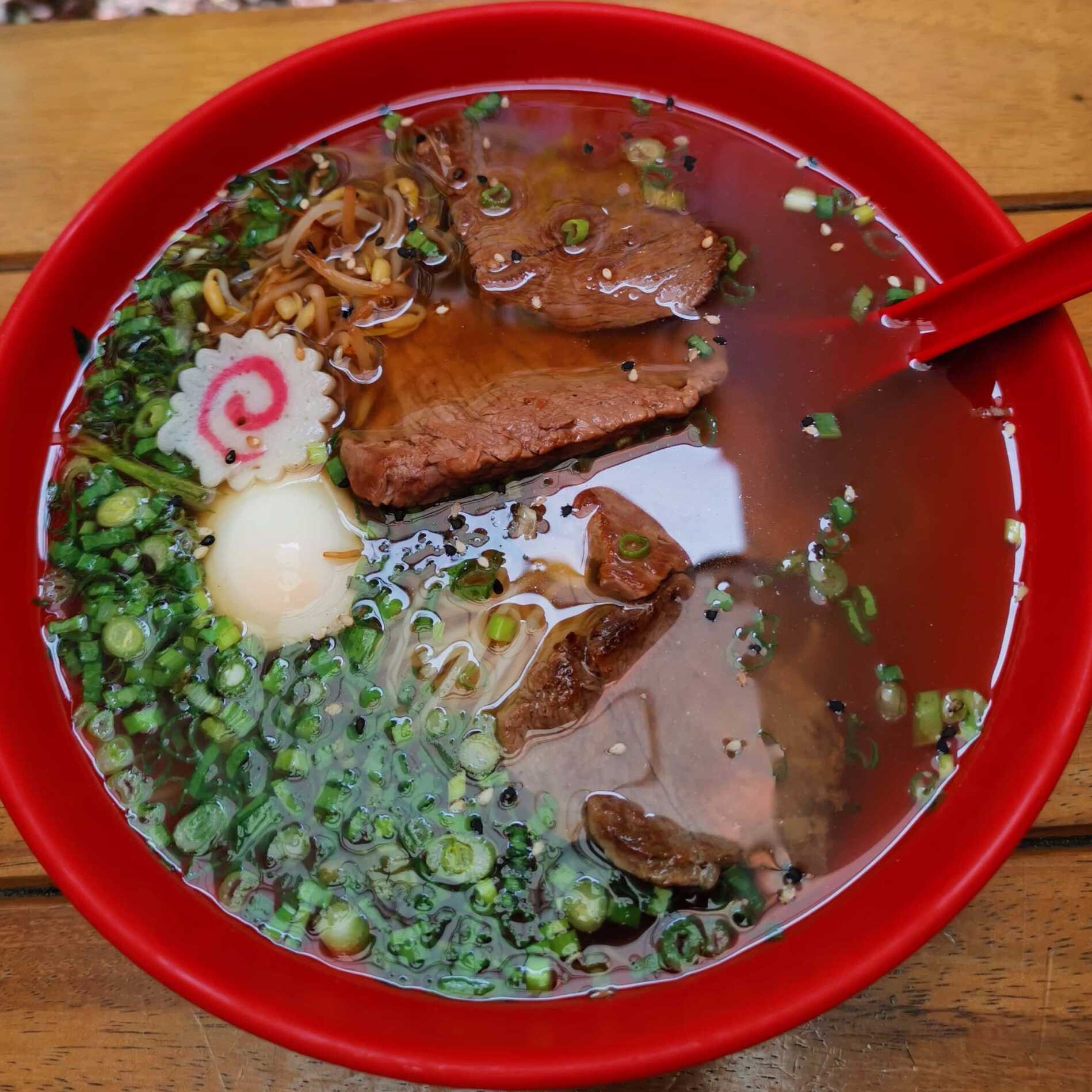 Caldo clásico con soya, cebollín, ajonjolí y carne de res.