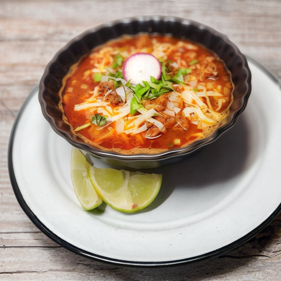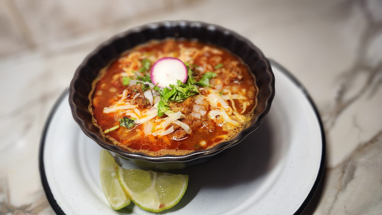 Maruchan hecha en consomé, acompañada queso navarro, birria, cebolla y cilantro.