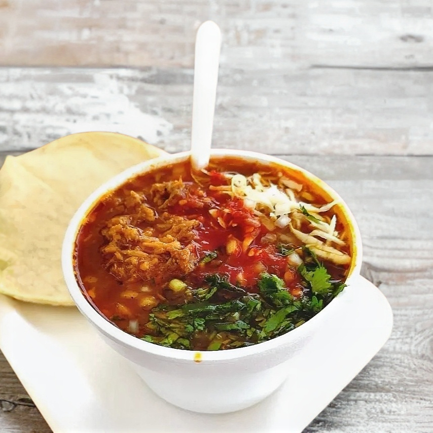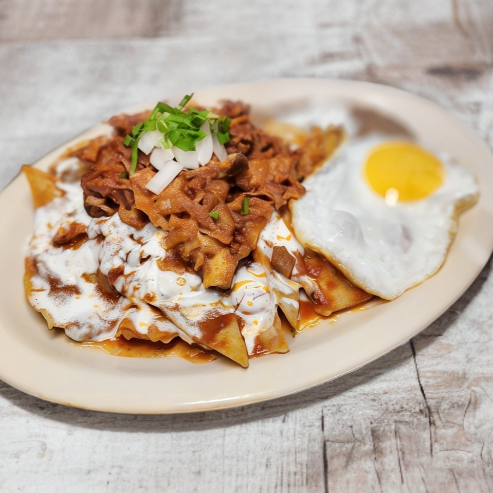 Hechos con tortilla de maíz frita cubiertos con una mezcla de salsa roja y consomé, una porción de birria, cebolla y cilantro, acompañados de frijoles y un huevo.