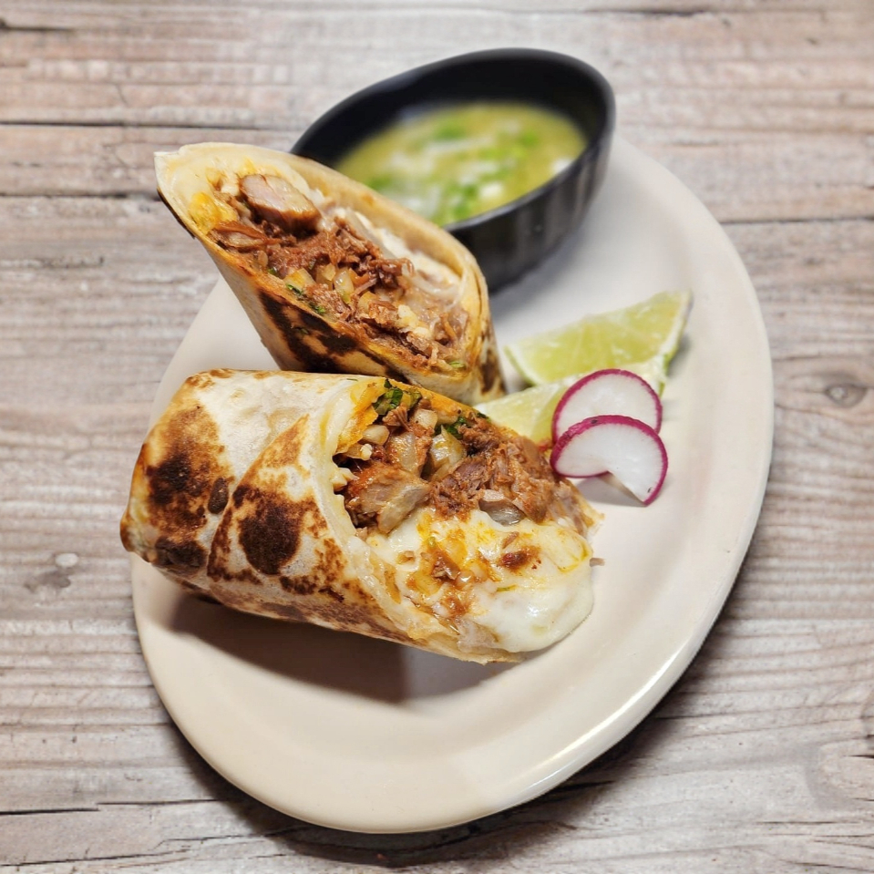 Hecho con tortilla de harina de 36 cm de diámetro, rellena de frijoles, queso navarro, birria, cebolla, cilantro y consomé. Acompañado de papas fritas.
