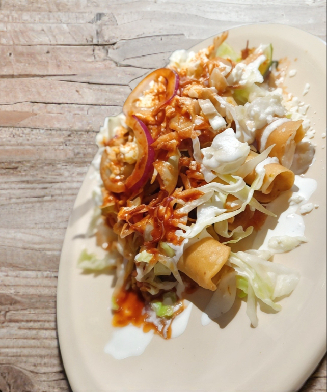 Ordèn de cuatro flautas crocantes de birria, cubiertas con lechuga, crema, queso, cebolla, acompañada de salsa roja y consomé.