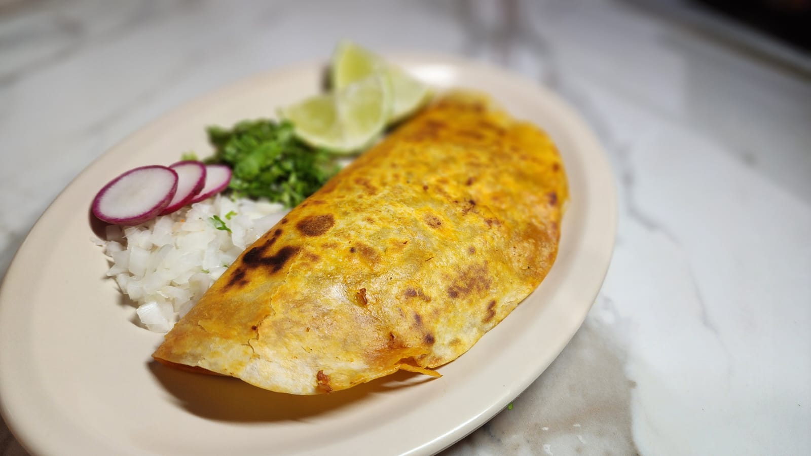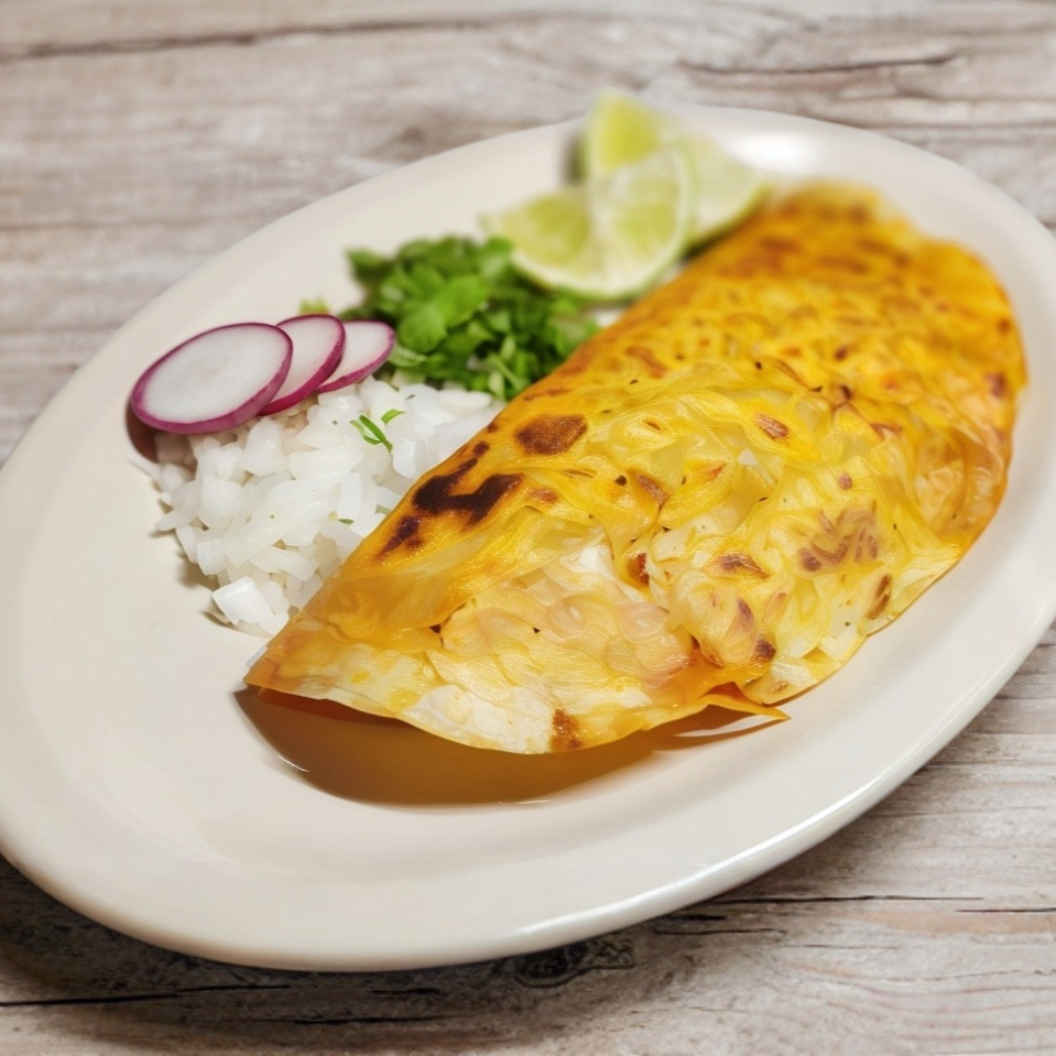 Quesadilla de 36 cm de diámetro, repleta de queso navarro, birria, cebolla, cilantro y consomé.