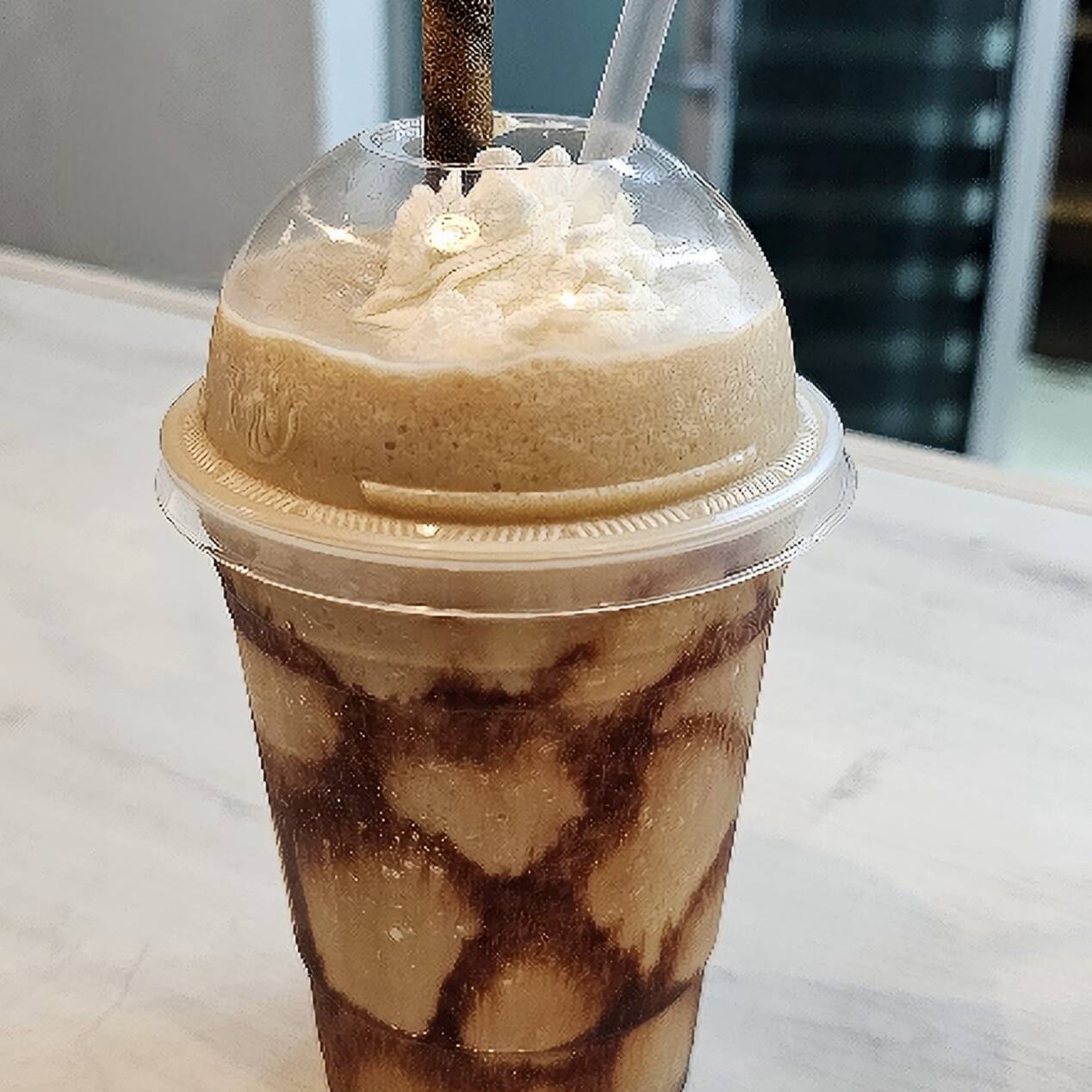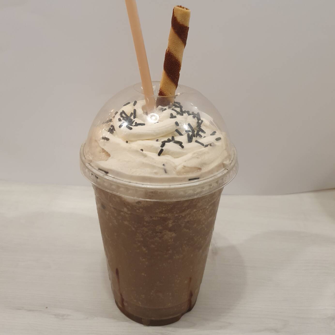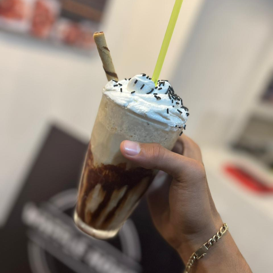 Frappé Grande de 16oz de Chocolate hershey´s adornado con chocolate liquido, crema batida, Grajea y barquillo