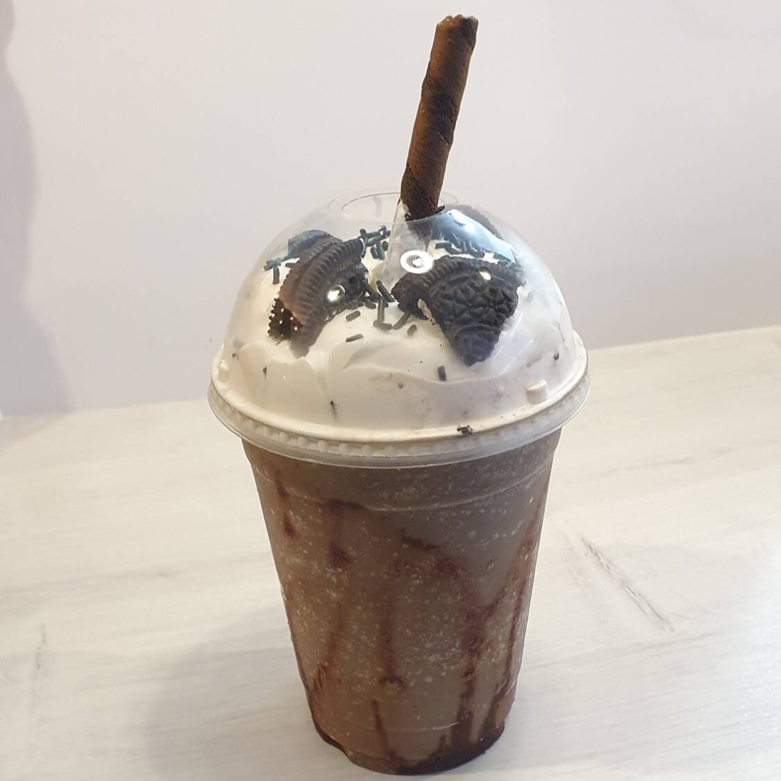 Frappé Grande de 16oz de Galleta Oreo, adornado con chocolate Hershey´s, Grajea y barquillo