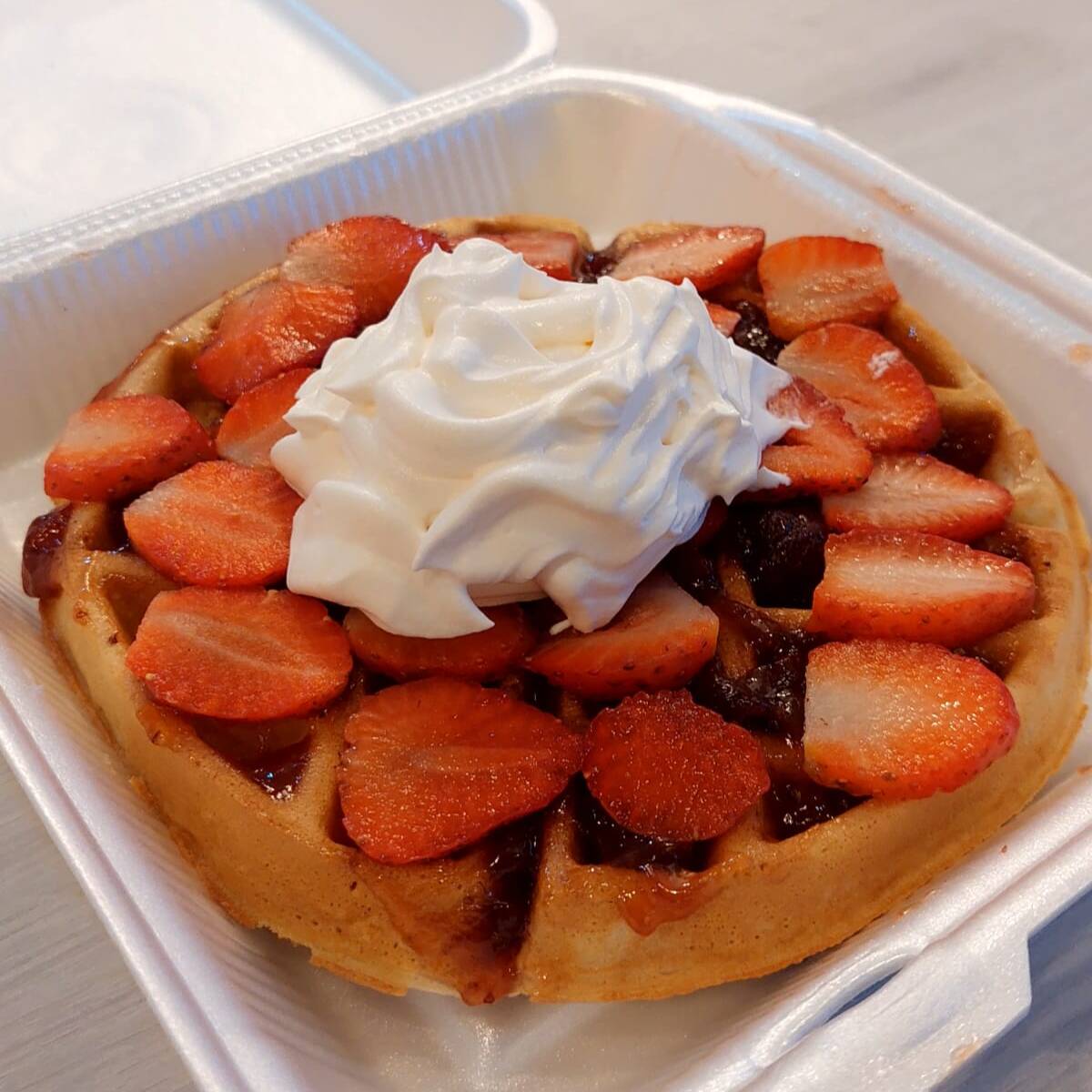Waffle grande con fresa, crema batida y chocolate