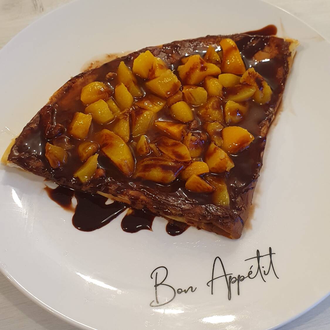 Crepa grande con durazno y manzana, base a elegir, toppings a elegir, bola de nieve y chocolate.
