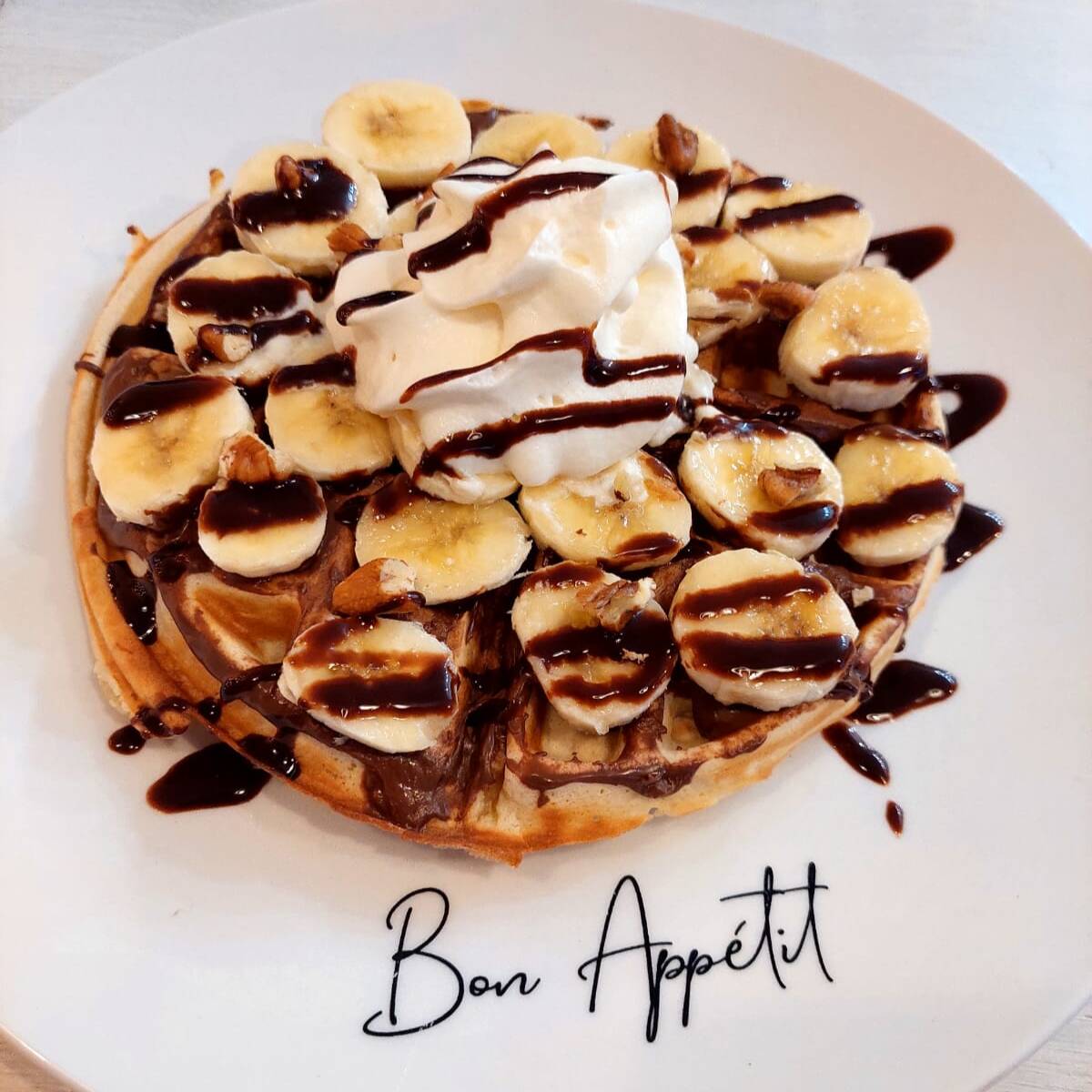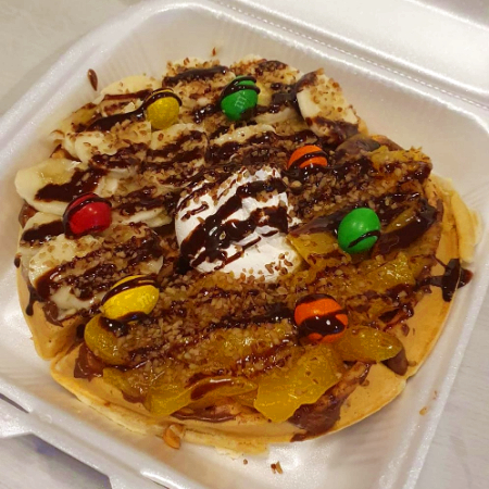 Waffle grande con, plátano, durazno, topping a elegir, chantilly y chocolate.