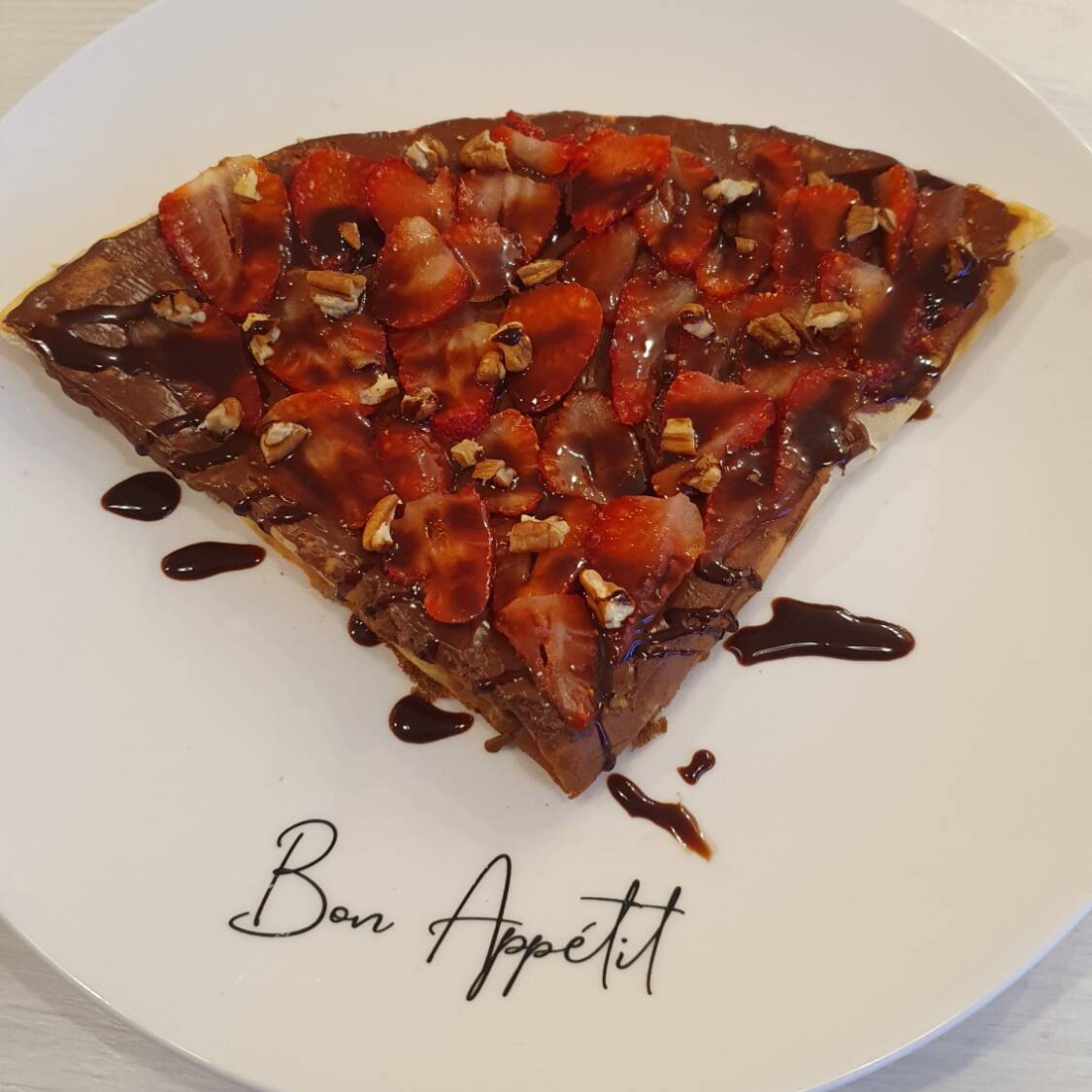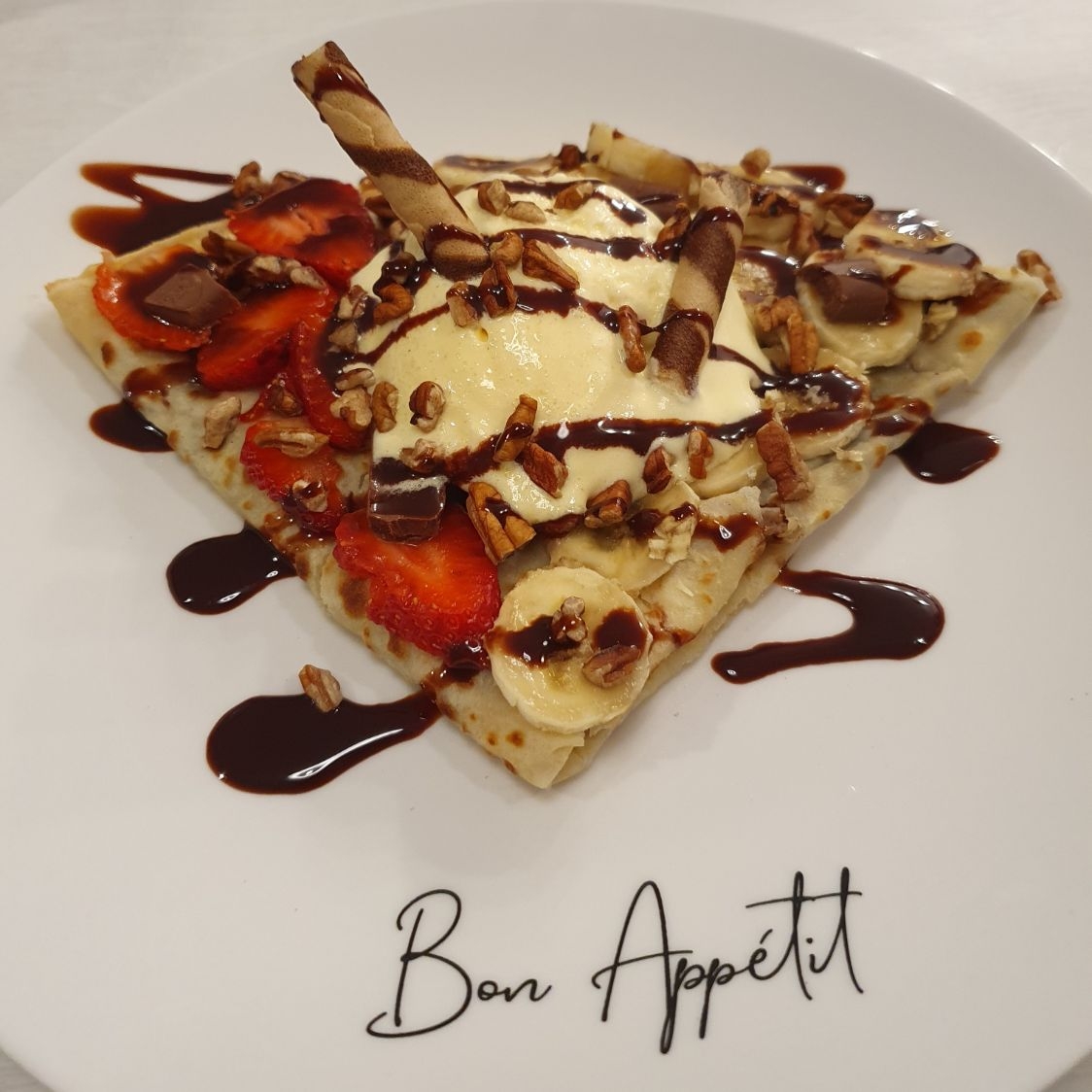 Crepa grande con plátano, nuez y chocolate.
