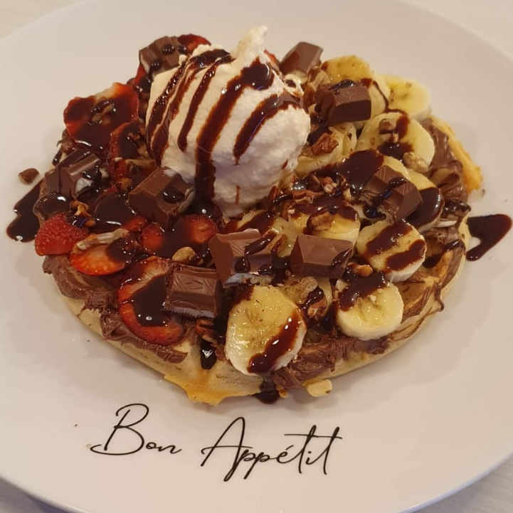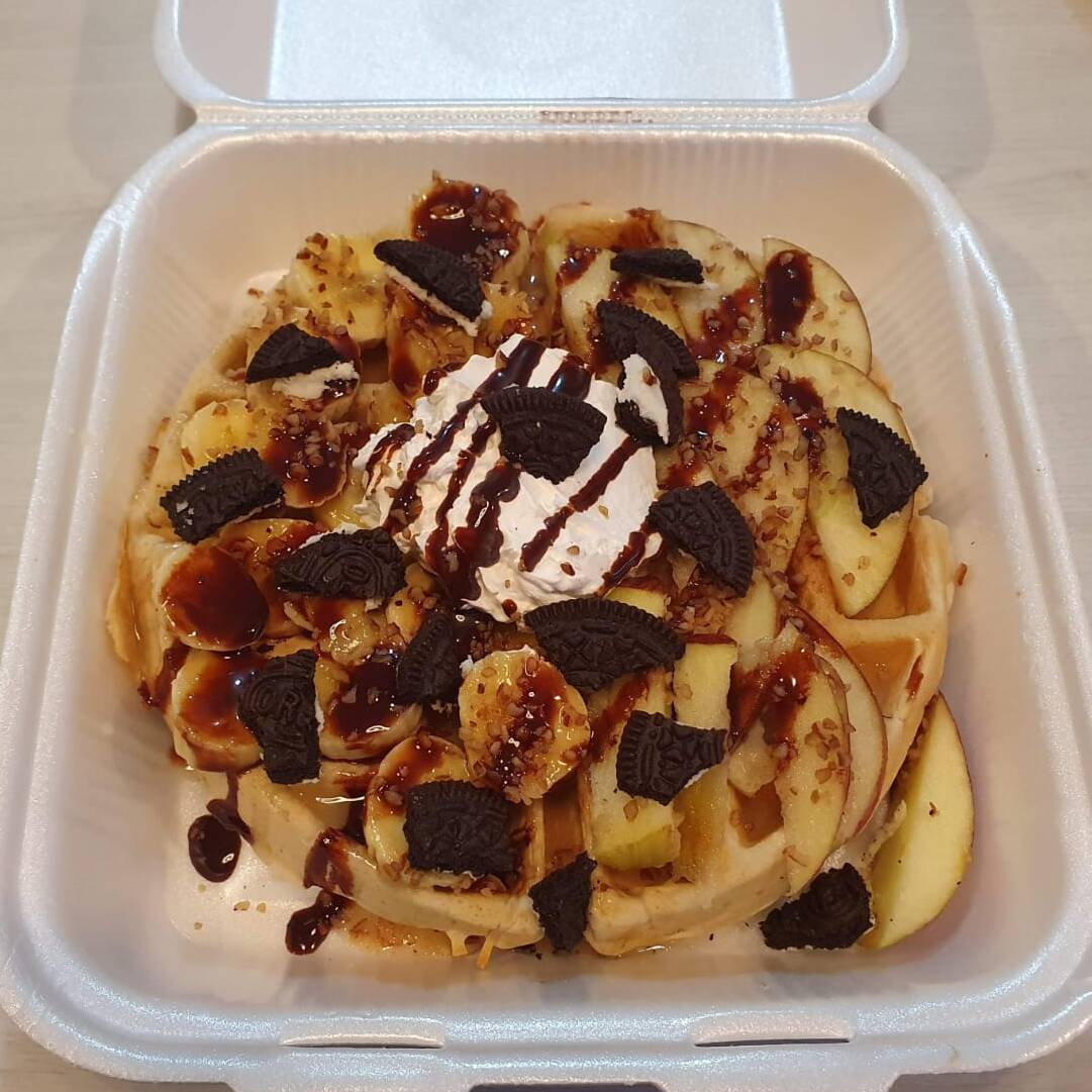Waffle grande con manzana, plátano, topping a elegir, chantilly y chocolate.