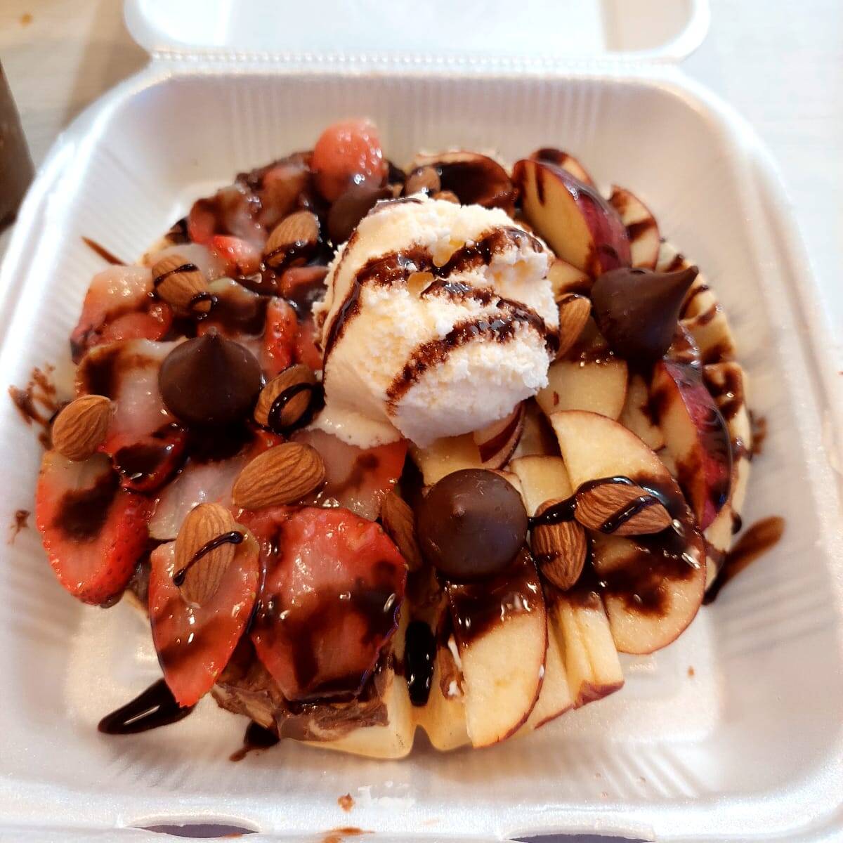 Waffle grande con fresa, durazno, topping a elegir, chantilly y chocolate.