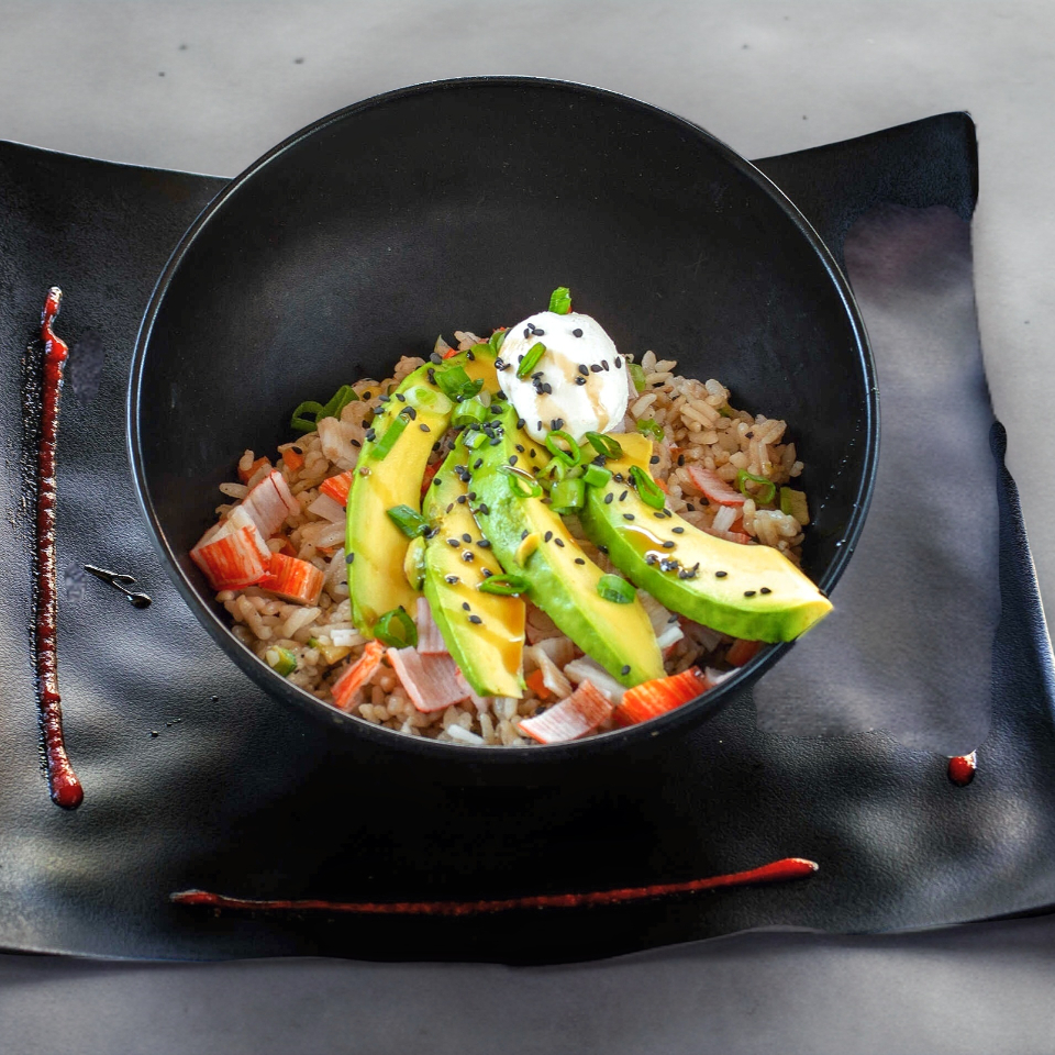 Arroz frito con aguacate, Philadelphia, surimi, un toque de salsa de anguila y ajonjolí.