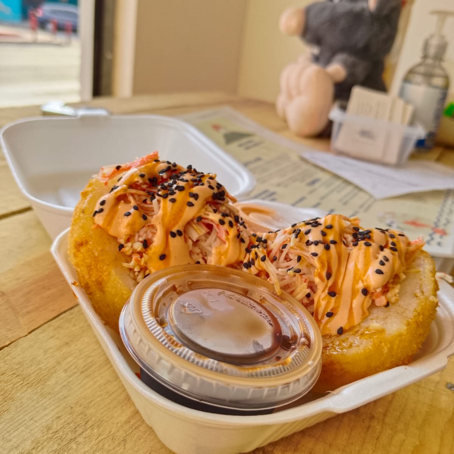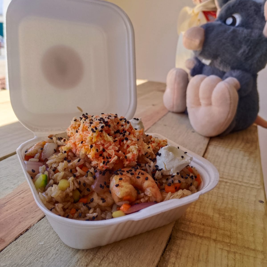 Camarones envueltos en fideos, arroz, kanikama y vegetales salteados.