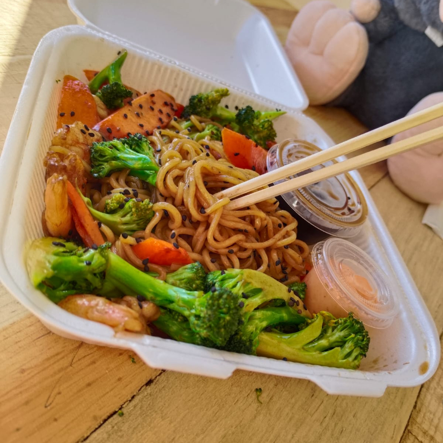 Fideos ramen, vegetales (brócoli, zanahoria) y proteína (pollo, res, o camarón).