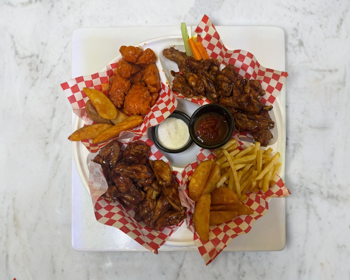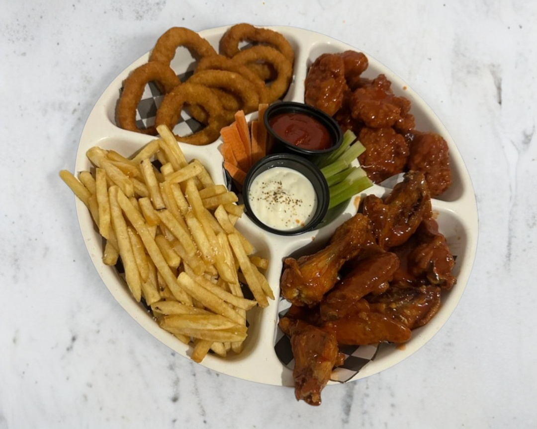 25 alitas, 5 boneless, palomitas de pollo, aros de cebolla y papas a la francesa