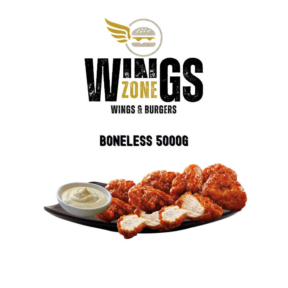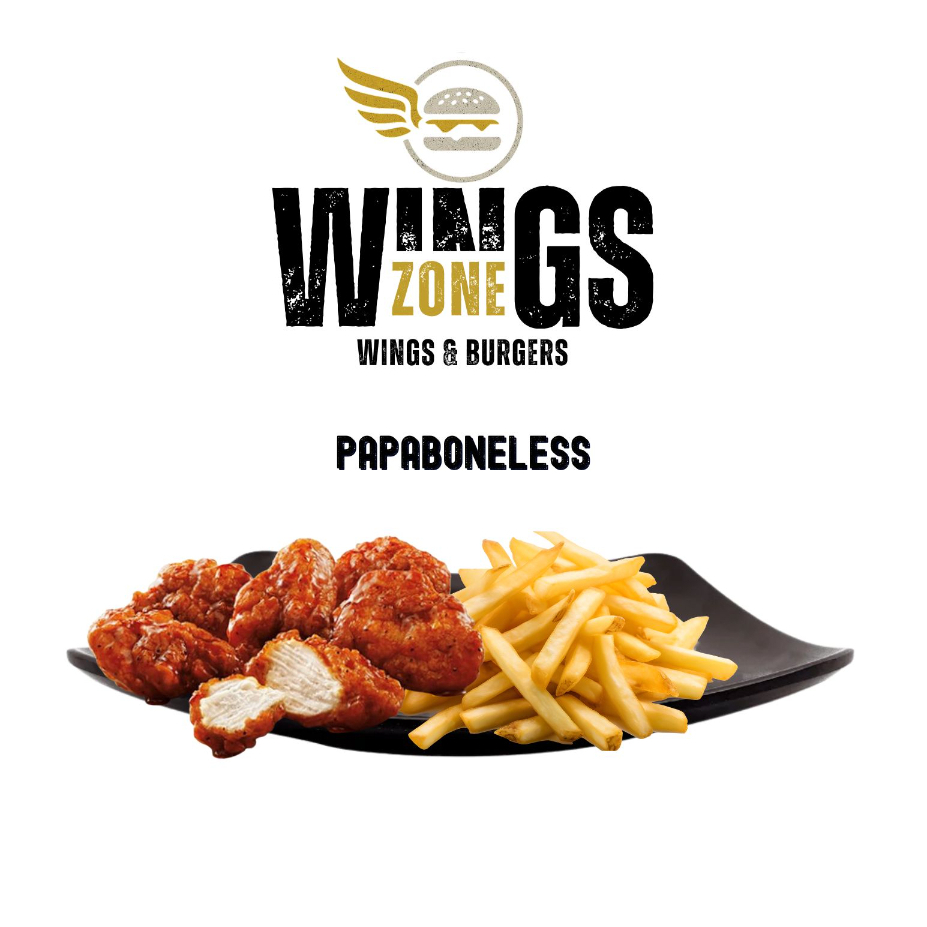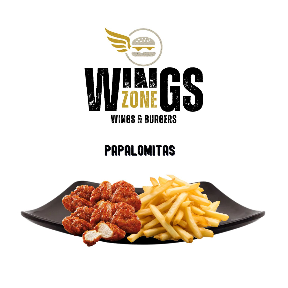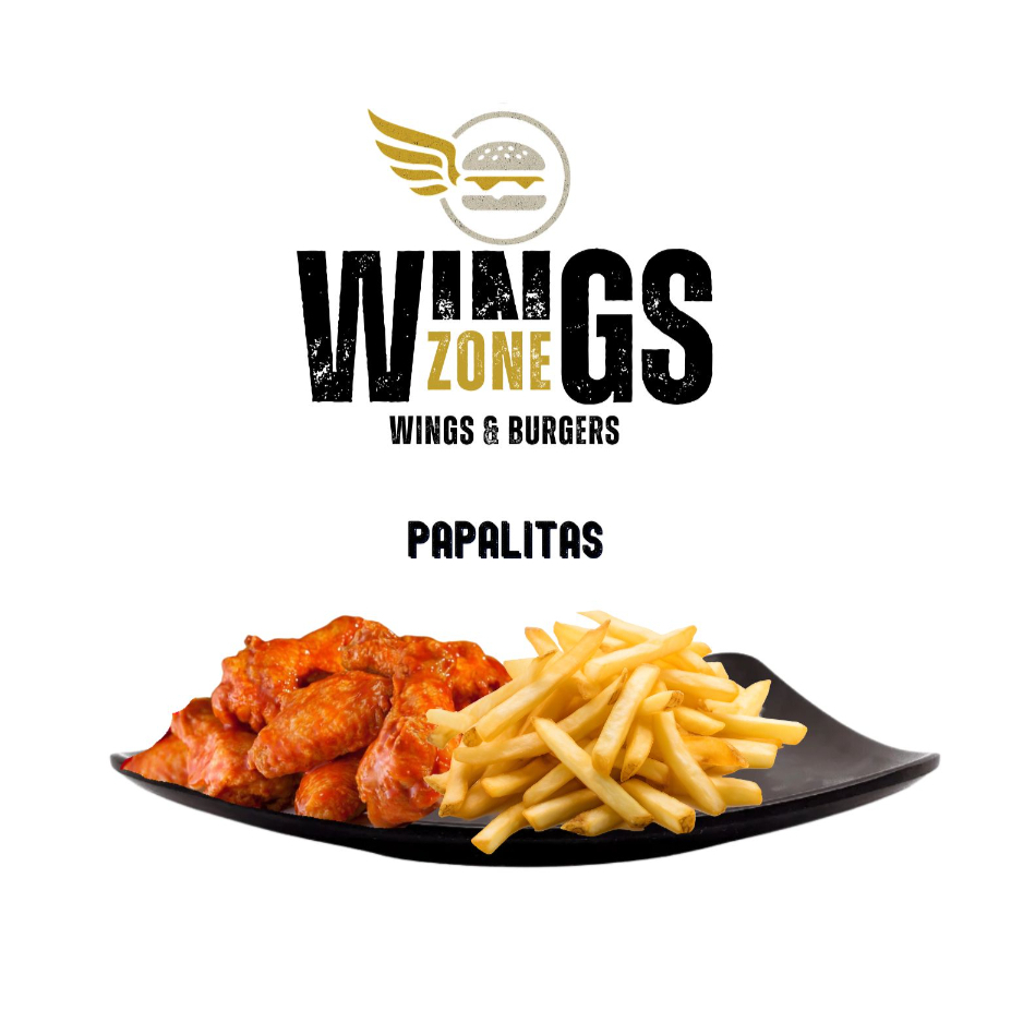 30 alitas, 5 boneless, papas gajo y papas a la francesa