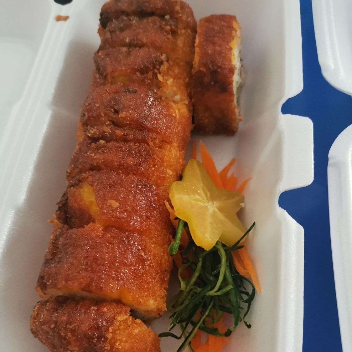 Por fuera una capa de Filadelfia y plátano macho, empanizado y cubierto de anguila