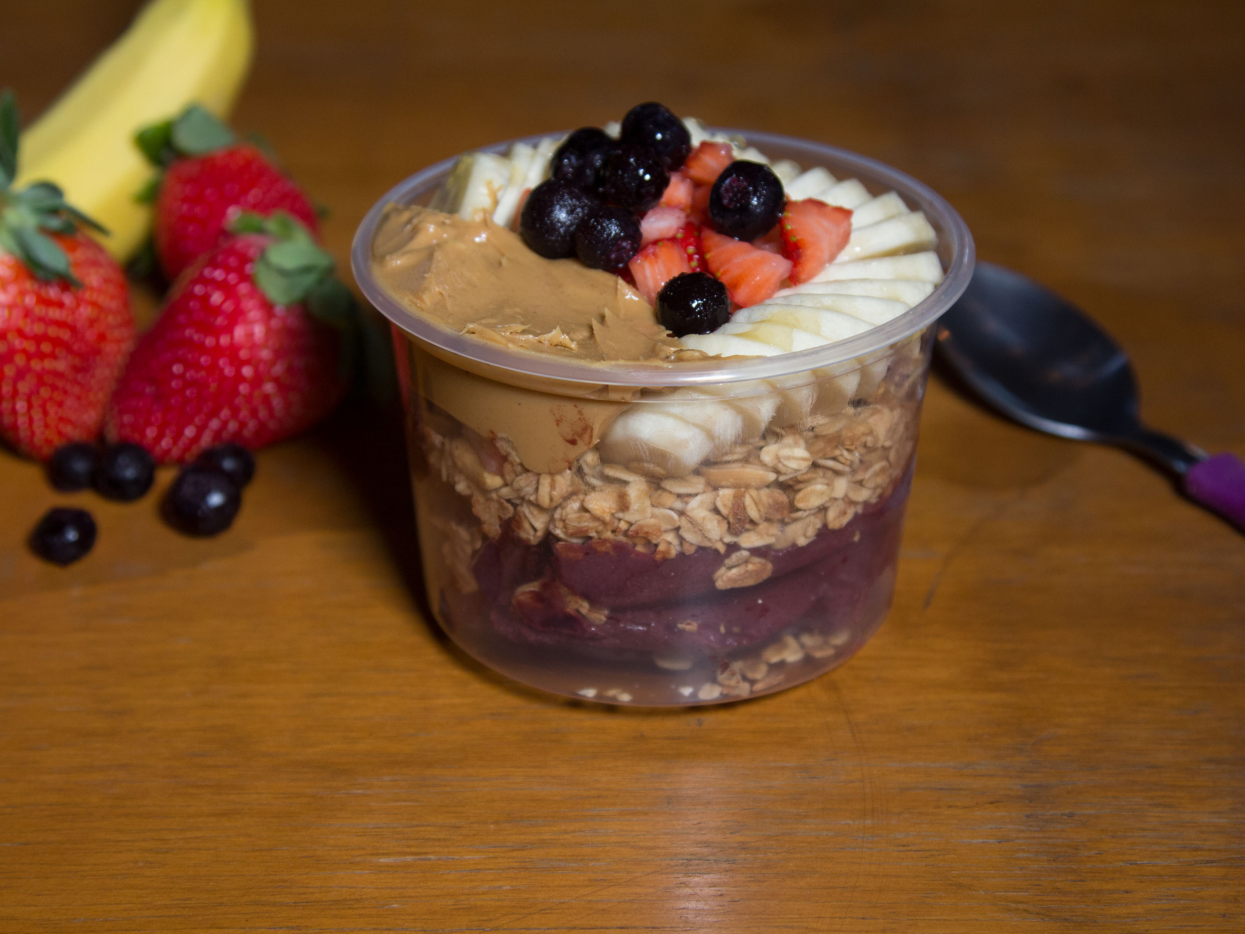 Acai, granola de la casa,plátano, crema de cacahuate, chocolate y coco