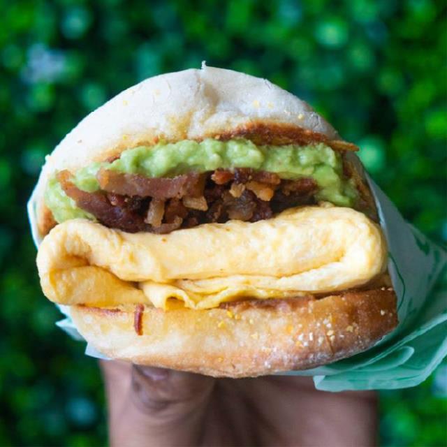 Pan muffin,huevo,mantequilla,queso amarillo,tocino,aguacate.