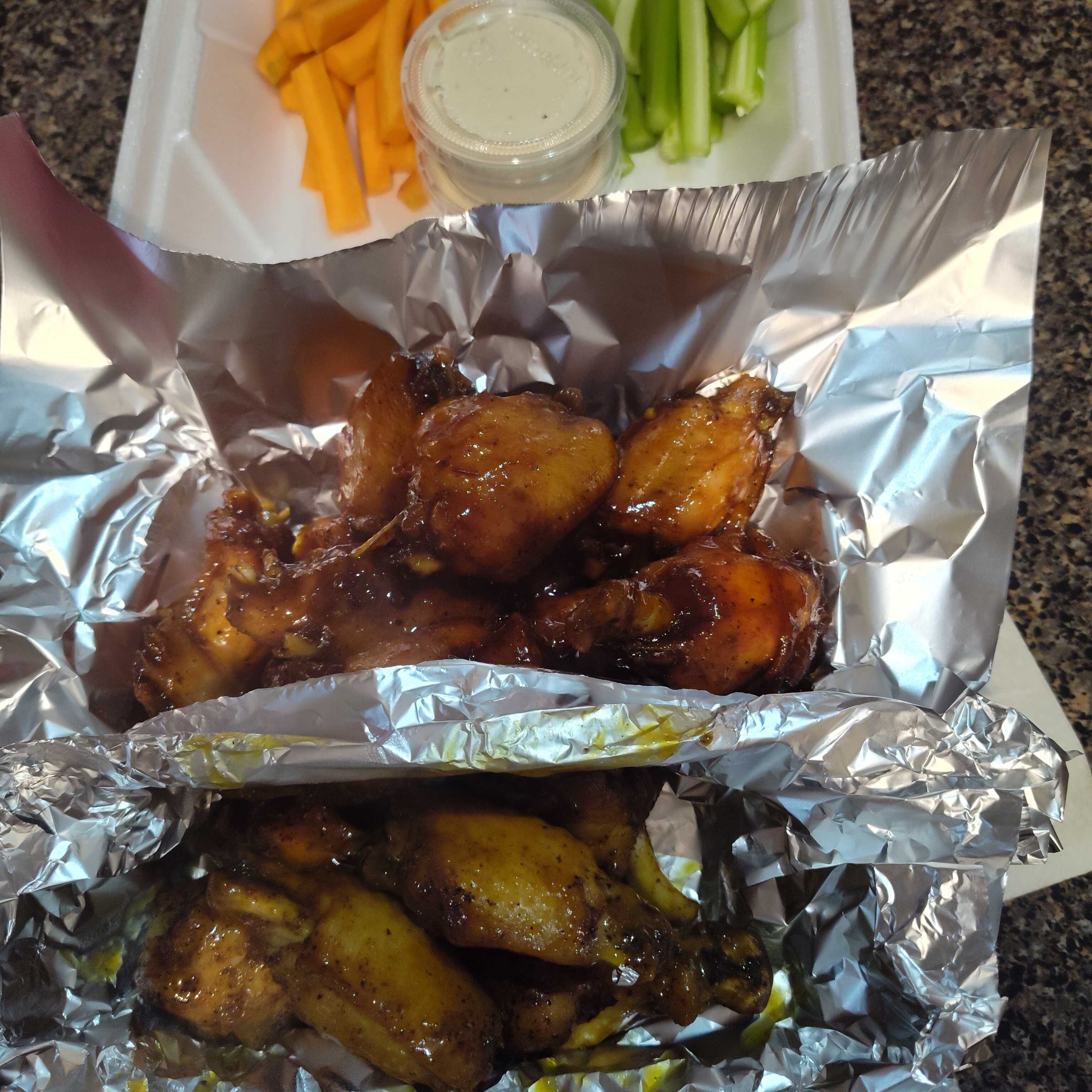 Medio kilo de alitas con la salsa de su preferencia acompañadas con zanahoria, apio y aderezo ranch