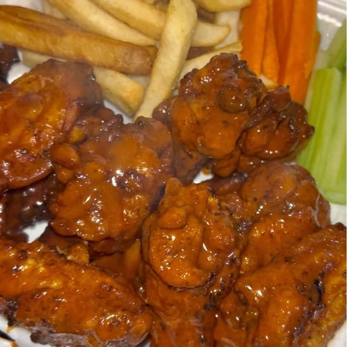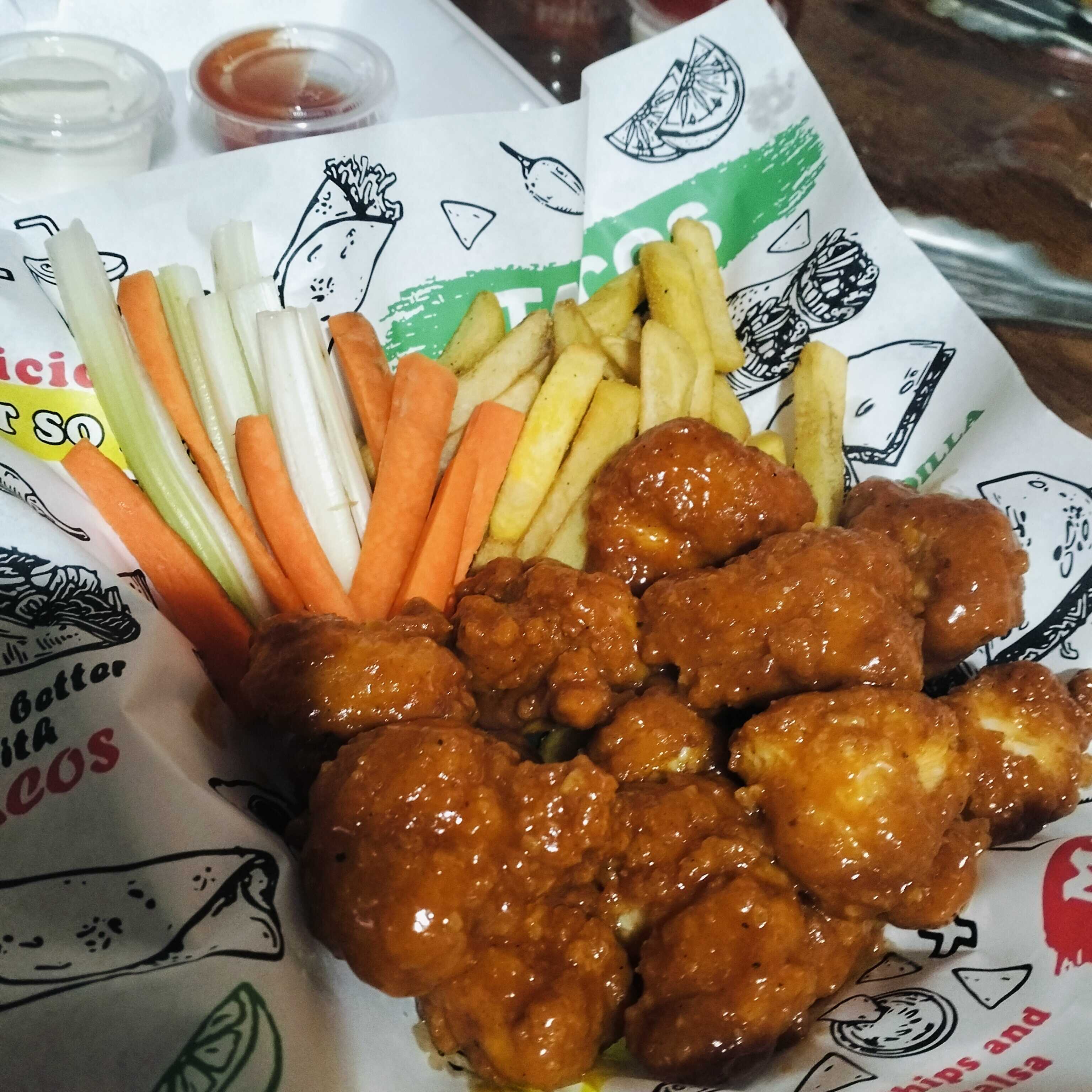 Boneless, papas fritas, apio, zanahoria, aderezo ranch y salsa catsup