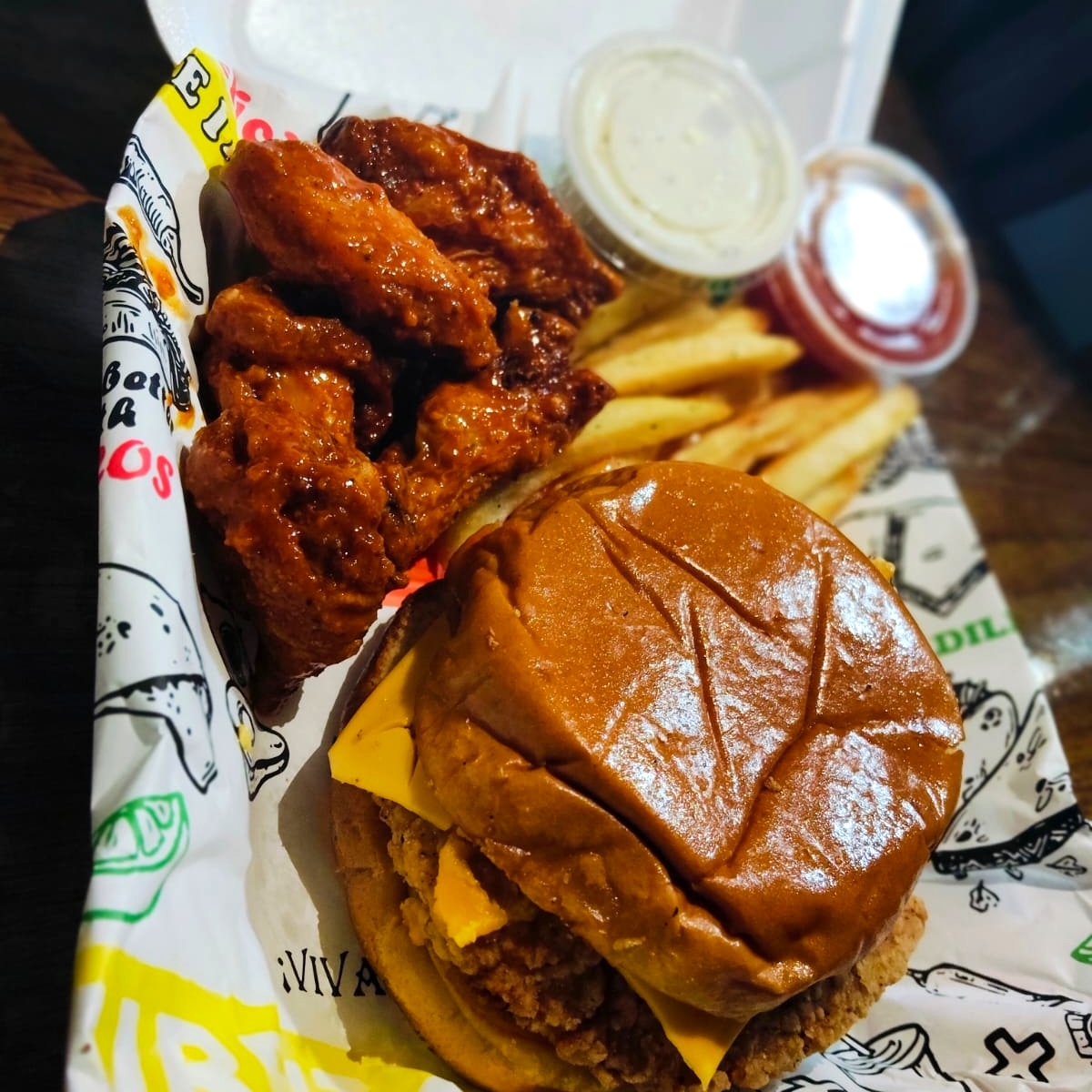 Chicken sandwich con tender, queso americano, papas fritas, alitas o boneless (6pz), aderezo ranch y salsa catsup