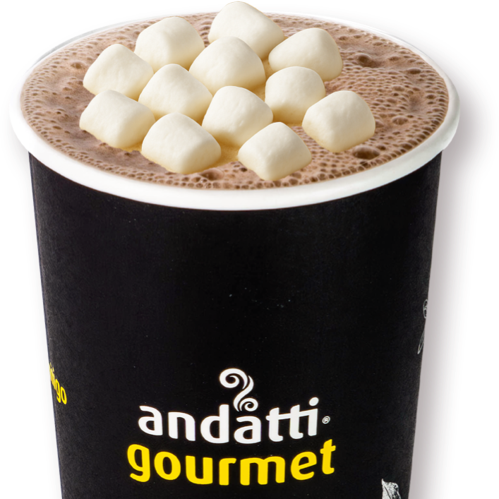 Delicioso chocolate caliente acompañado de bombones, dando mayor cremosidad a nuestra bebida de temporada.