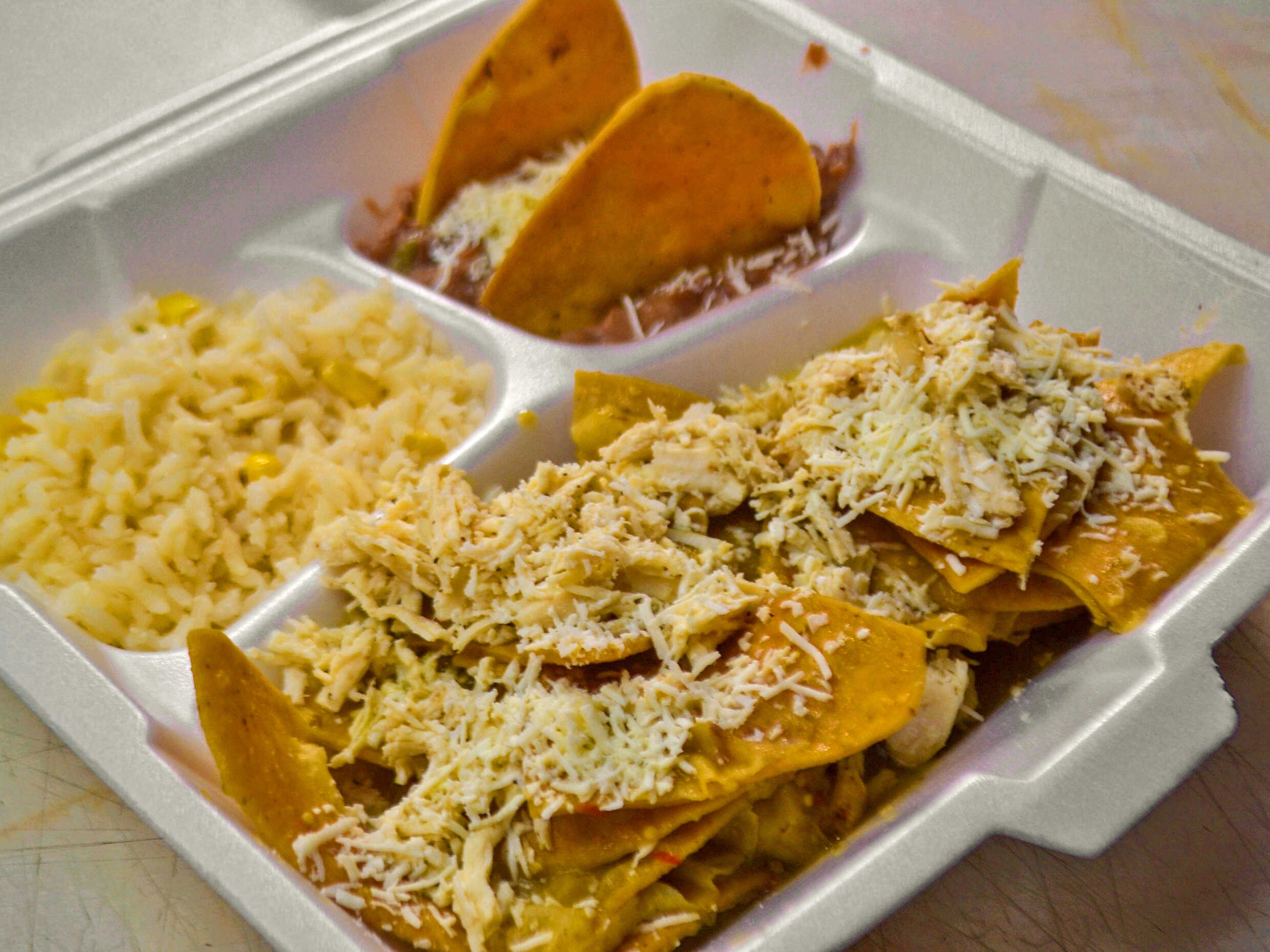 Huevo con tortillas doradas, frijol con queso y totopos y arroz rojo.