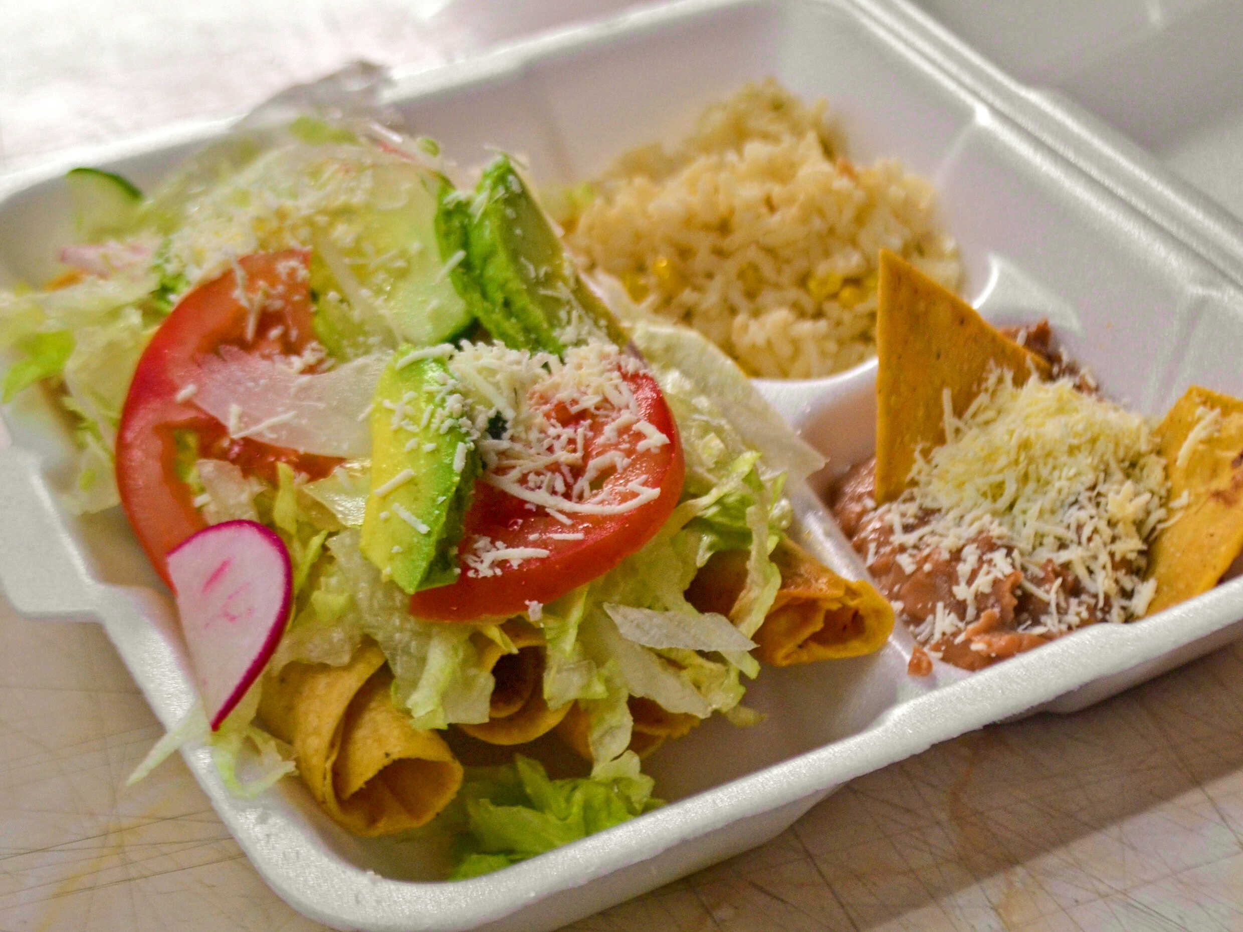 5 piezas. Lechuga, tomate, pepino, rábano y salsa ( picosa )Con arroz y frijol