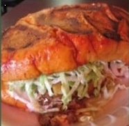 Pan telera dorado con salsa de chile guajillo (no picante), relleno de papa con chorizo, lleva lechuga, crema y queso seco.