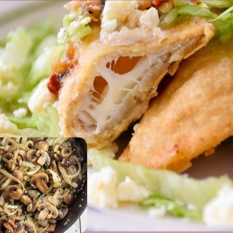 Quesadilla frita de masa con champiñones (champiñones, sofritos con cebolla caramelizada), picante, queso monterrey, lleva lechuga, crema y queso seco.