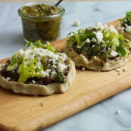Gorditas de maiz rellena de tinga de res ,preparada con lechuga, crema y queso seco