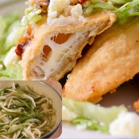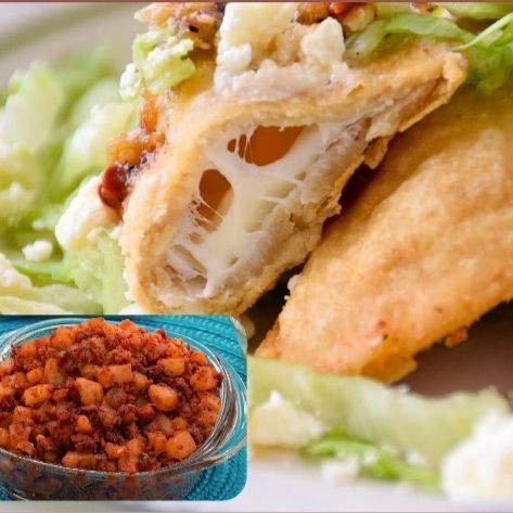 Quesadilla frita de masa con papa y chorizo, sin picante y queso monterrey, lleva lechuga, crema y queso seco.