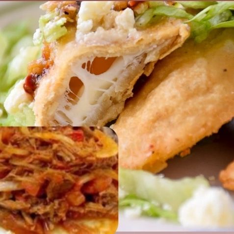 Quesadilla frita de masa con tinga de pollo (pollo deshebrado con tomate y cebolla), sin picante, queso monterrey, lechuga, crema y queso seco.