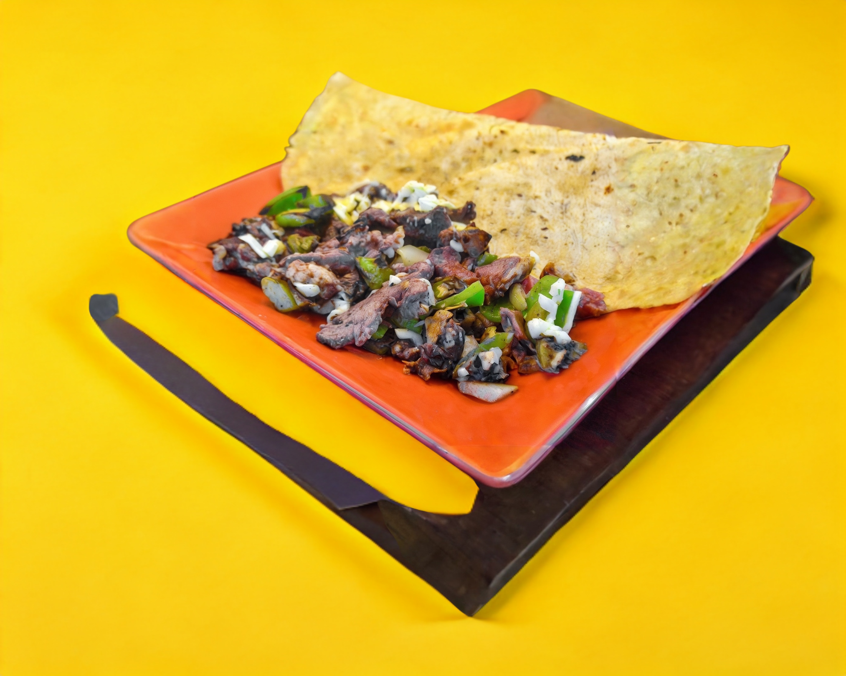 Cebolla, chile morrón, tocino, carne asada con queso monterrey. y 4 tortillas hechas a mano