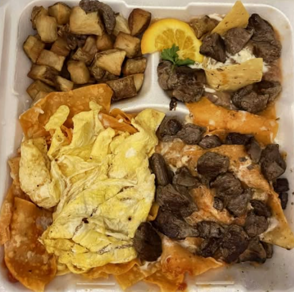Arrachera, un huevo revuelto y chilaquiles rojos, acompañados de papa campesina y frijol.